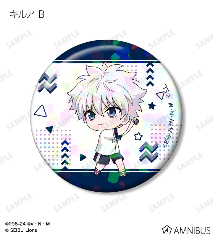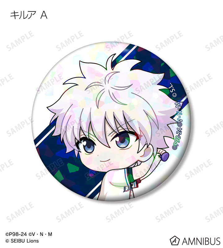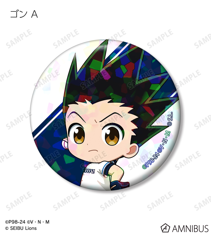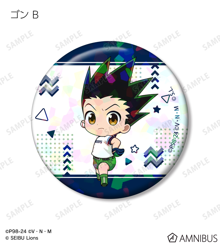 ゴン、キルア、レオリオ、クラピカ、ヒソカの描き起こしちびキャライラストをチームカラーに合わせ、ホログラム加工を施した缶バッジに仕上げました。