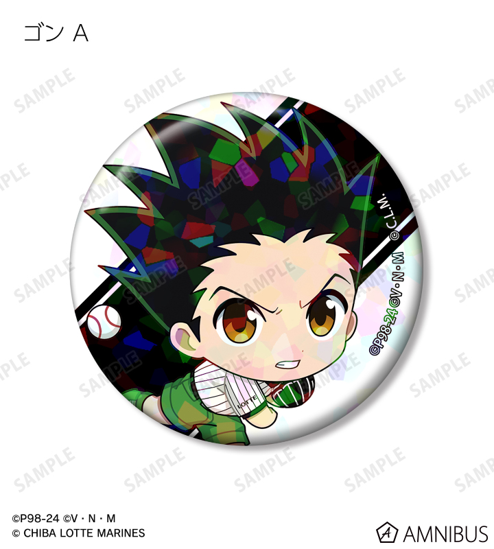 ゴン、キルア、レオリオ、クラピカ、ヒソカの描き起こしちびキャライラストをチームカラーに合わせ、ホログラム加工を施した缶バッジに仕上げました。
