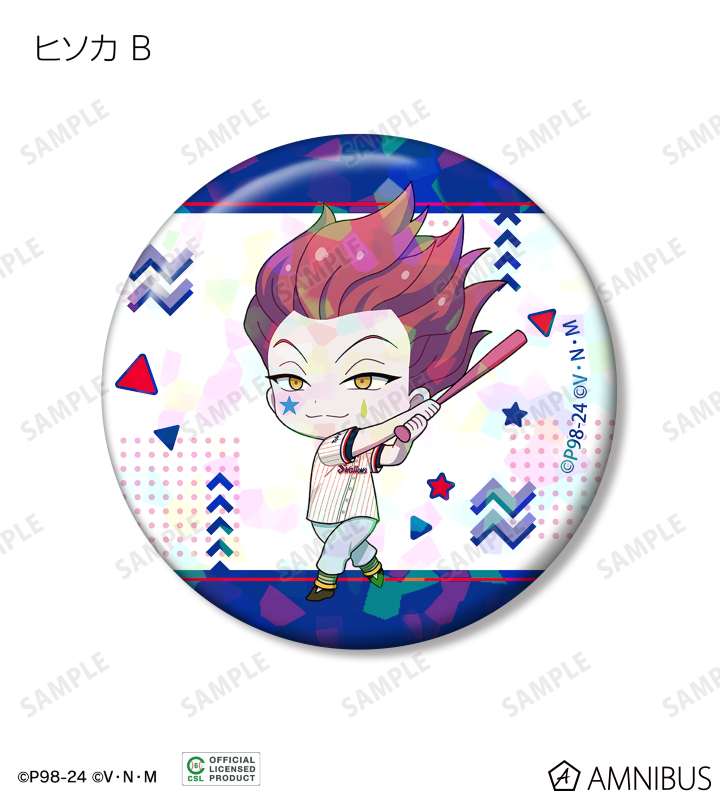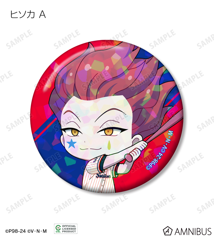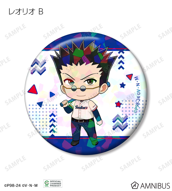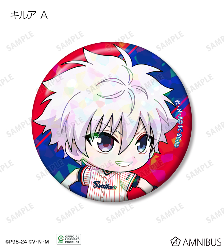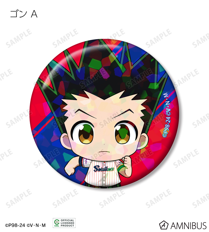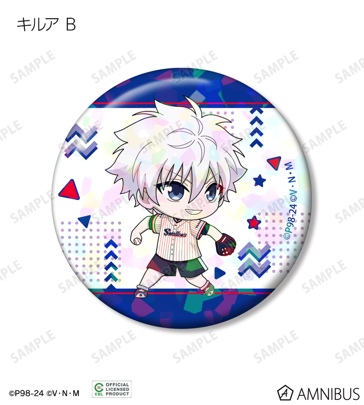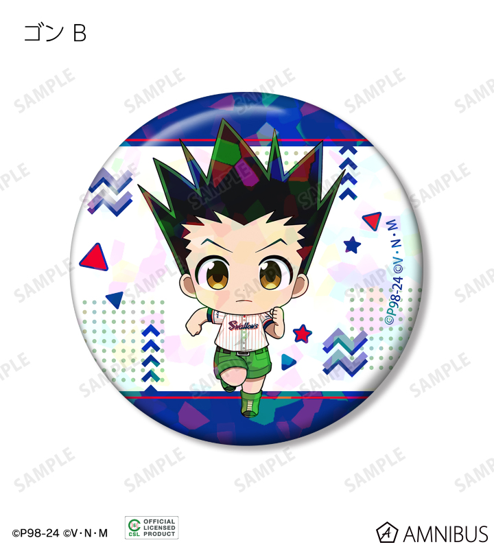 ゴン、キルア、レオリオ、クラピカ、ヒソカの描き起こしちびキャライラストをチームカラーに合わせ、ホログラム加工を施した缶バッジに仕上げました。