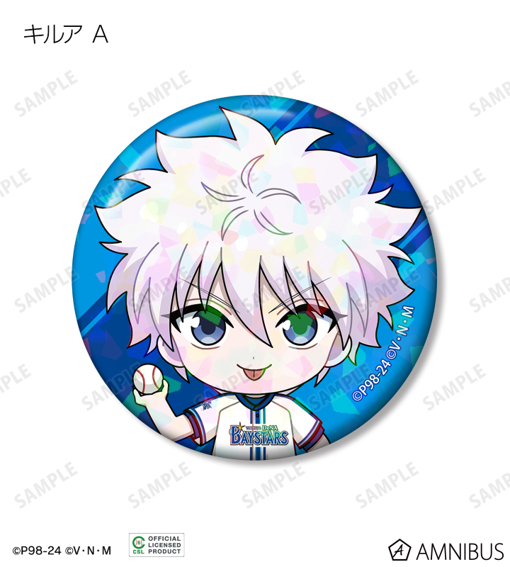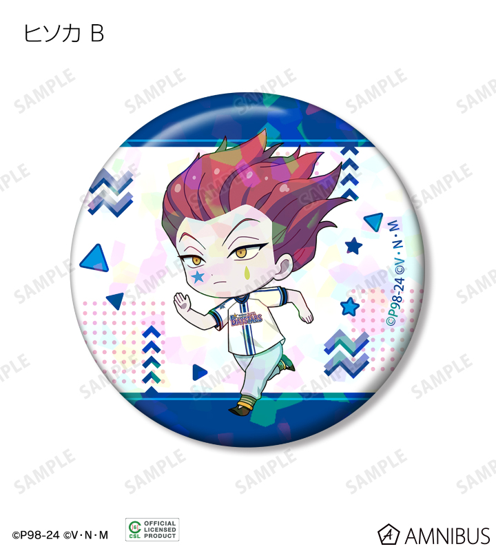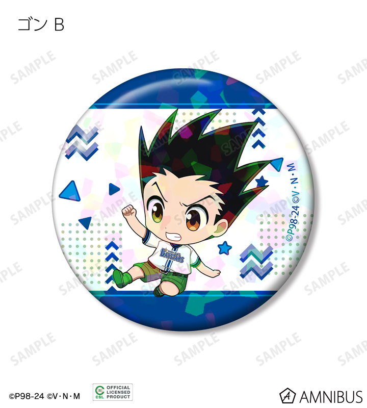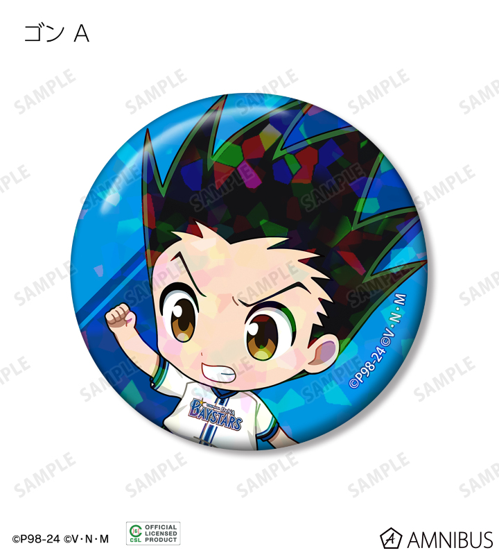 ゴン、キルア、レオリオ、クラピカ、ヒソカの描き起こしちびキャライラストをチームカラーに合わせ、ホログラム加工を施した缶バッジに仕上げました。