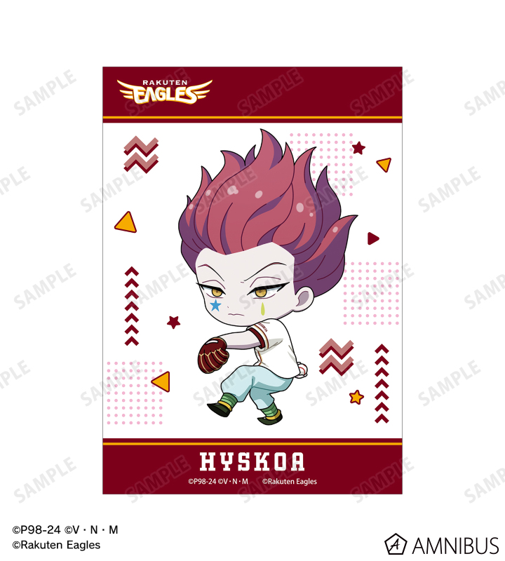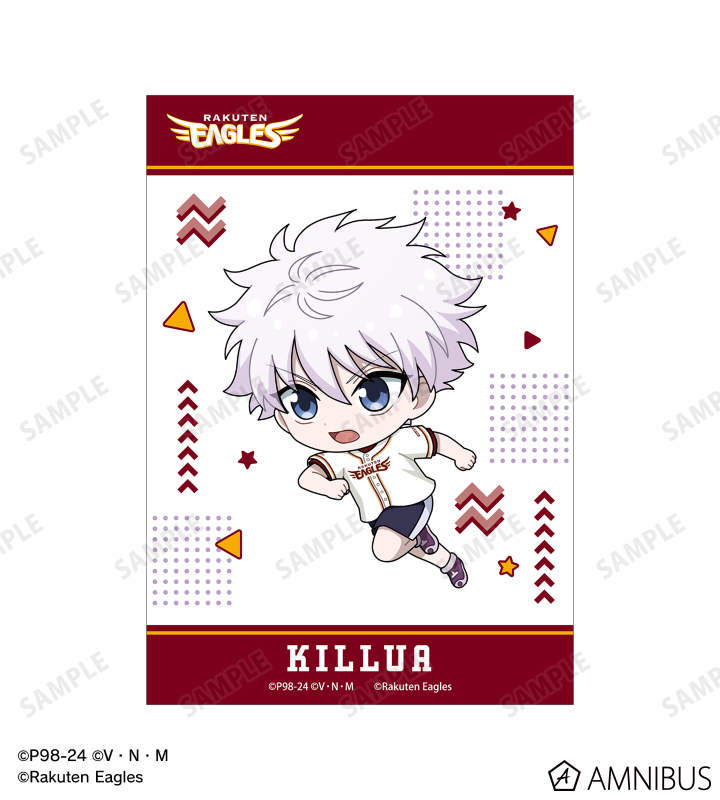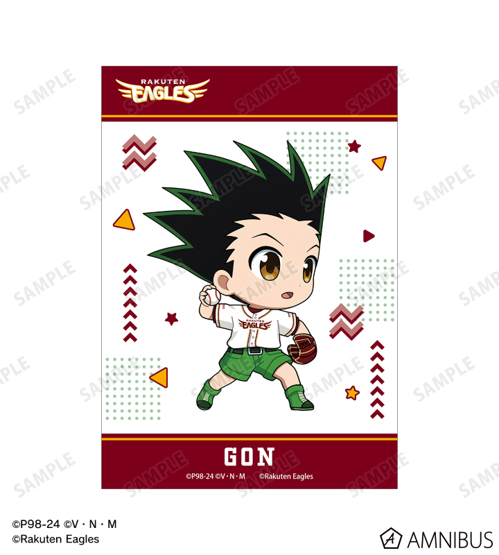 ゴン、キルア、レオリオ、クラピカ、ヒソカの描き起こしちびキャライラストと球団のロゴをチームカラーに合わせたブロマイド5枚セットに仕上げました。