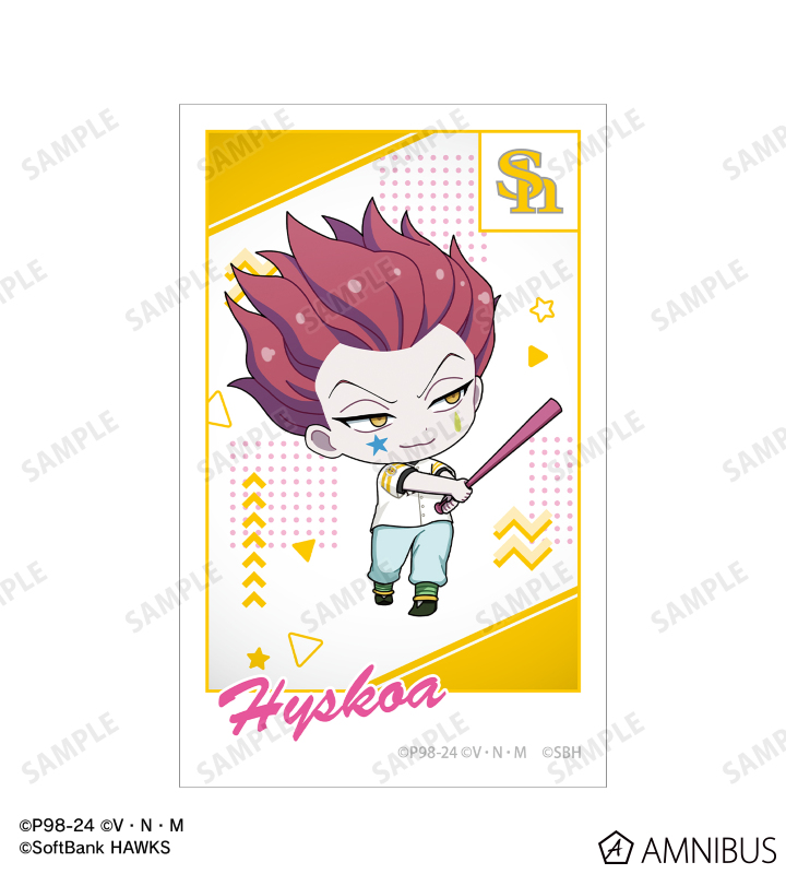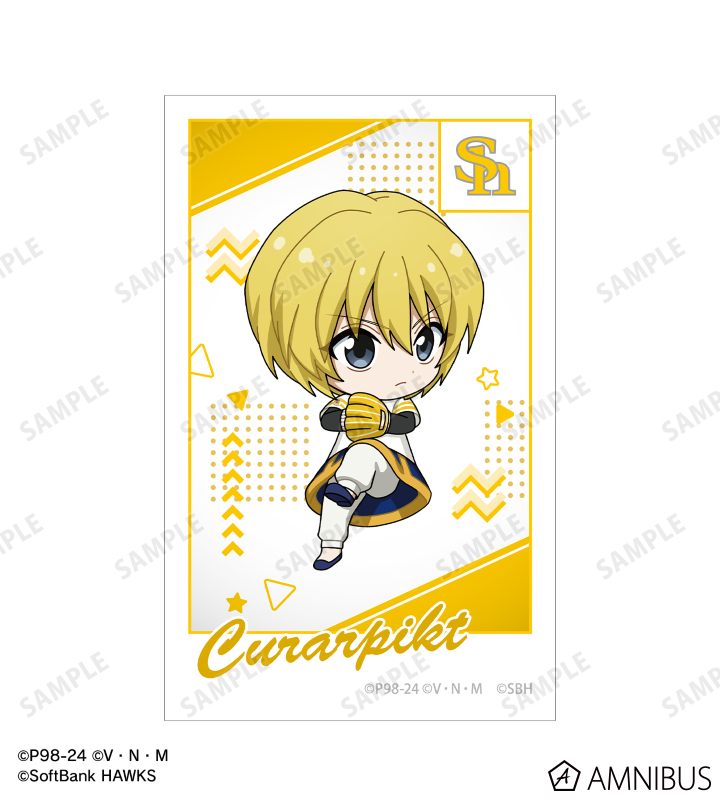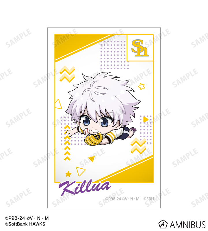 ゴン、キルア、レオリオ、クラピカ、ヒソカの描き起こしちびキャライラストと球団のロゴを、チームカラーに合わせたインスタントフィルム風のイラストカードに仕上げました。