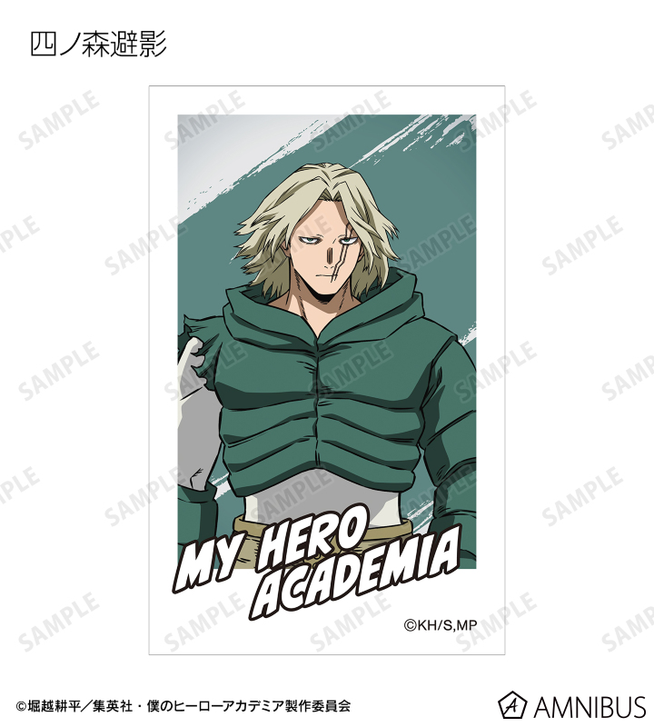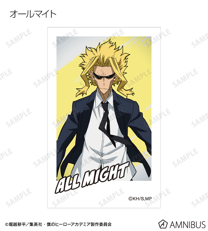 オールマイト、エンデヴァー、ベストジーニスト、エッジショット、スターアンドストライプ、ワン・フォー・オール 3代目継承者、四ノ森避影、志村菜奈、死柄木弔、トガヒミコのビジュアルをインスタントカメラ風のイラストカードに仕上げました。