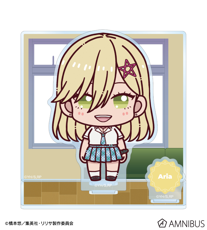 喜咲アリアがちょこんと立っているちびキャラを新たに描き起こし、パーツ付きのBIGなアクリルスタンドに仕上げました。