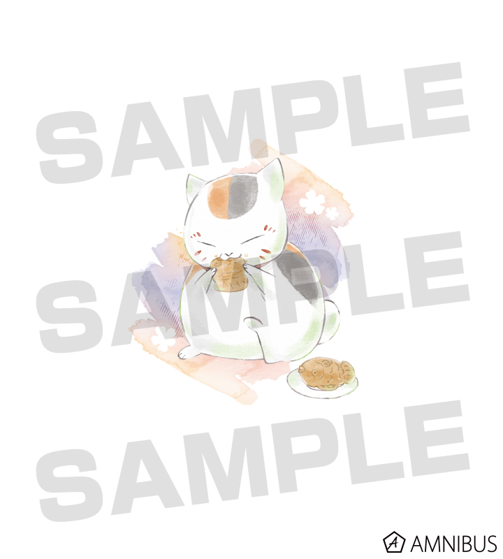 水彩風に仕上げたたい焼きを食べているニャンコ先生を、淡いカラーリングの背景と組み合わせてデザインしています。