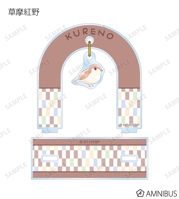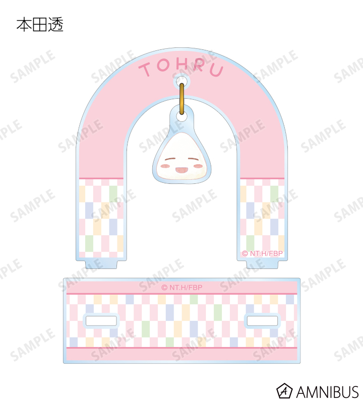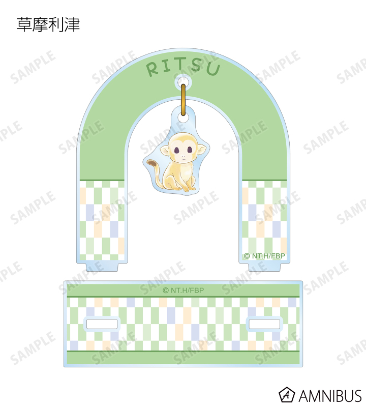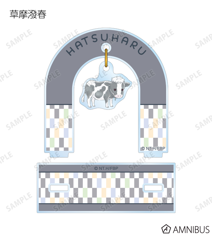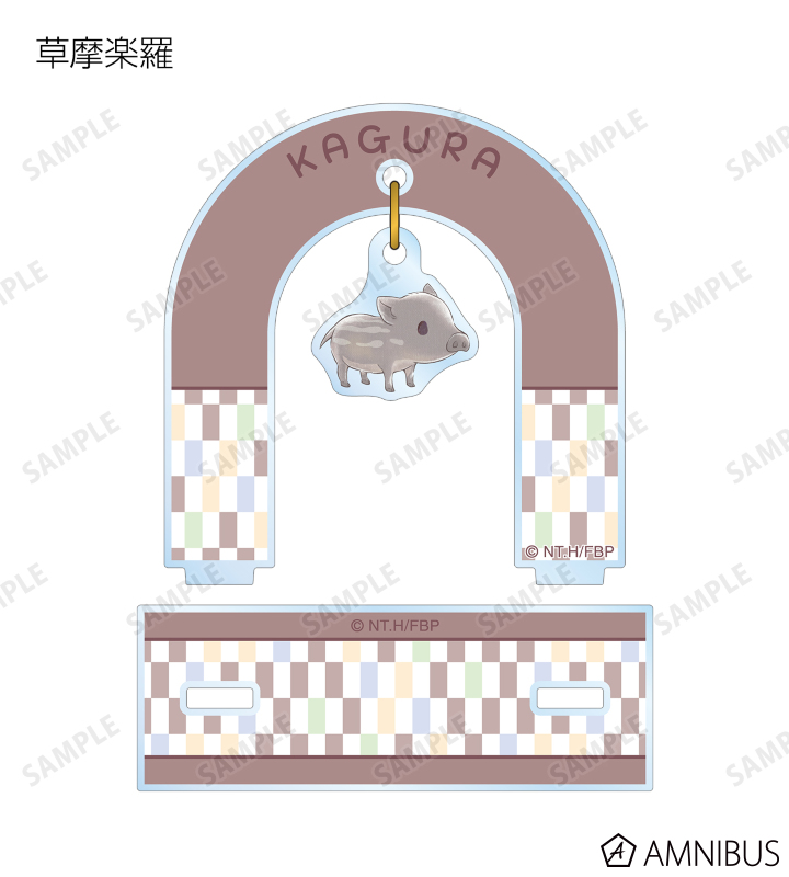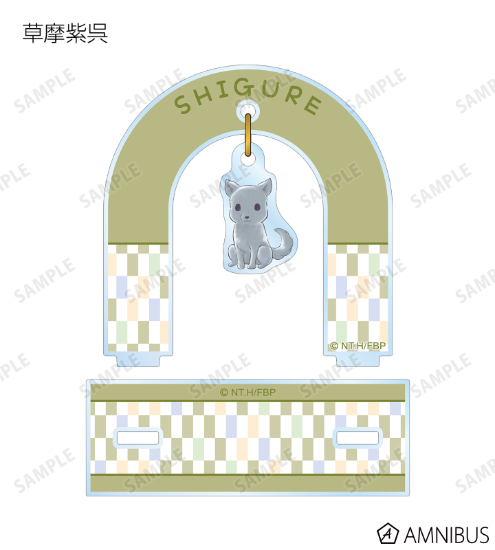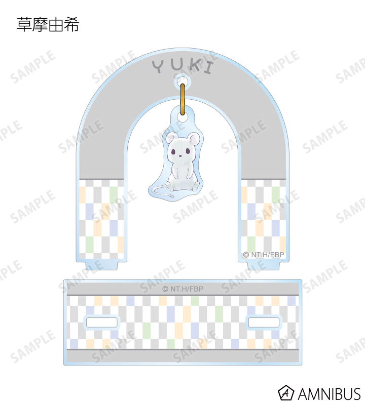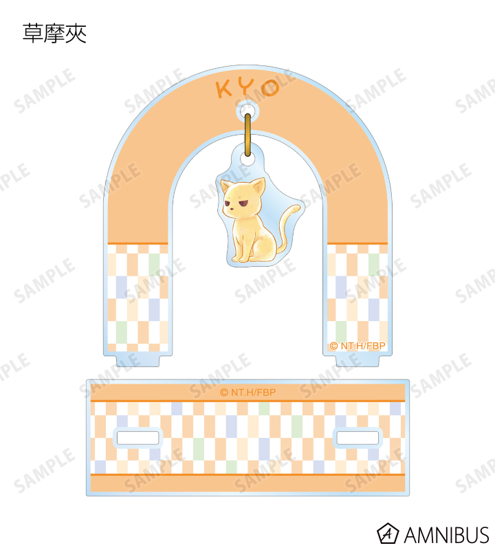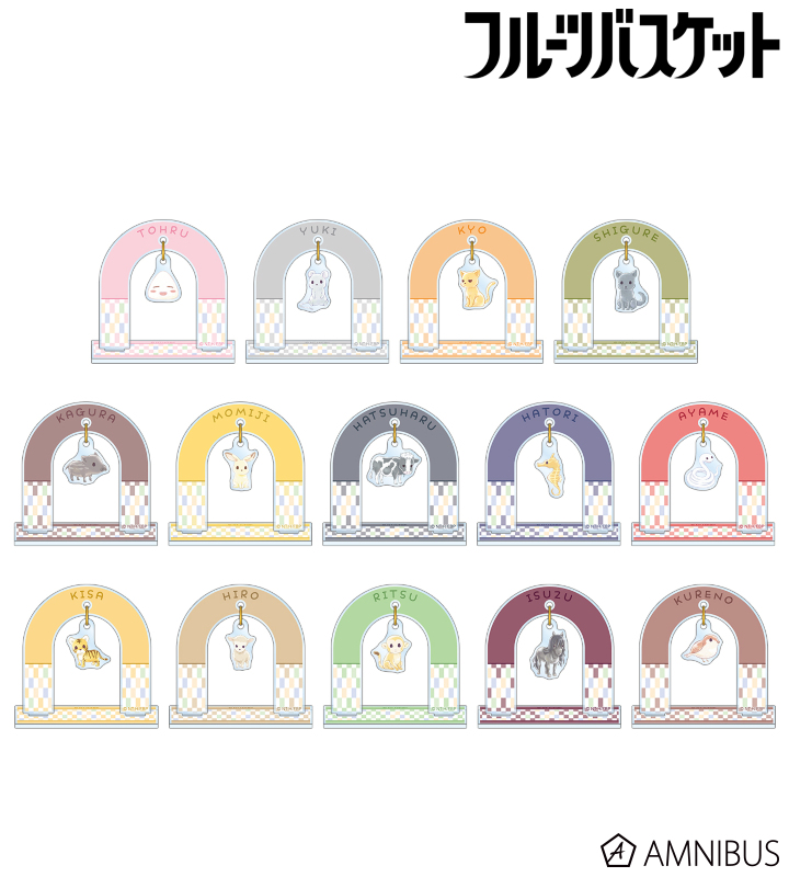 本田透、草摩由希、草摩夾、草摩紫呉、草摩楽羅、草摩紅葉、草摩潑春、草摩はとり、草摩綾女、草摩杞紗、草摩燈路、草摩利津、草摩依鈴、草摩紅野が動物に変身した姿の描き起こしちびキャライラストをメインにゆらゆら動くアクリルスタンドに仕上げました。
