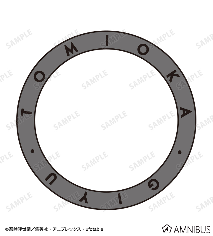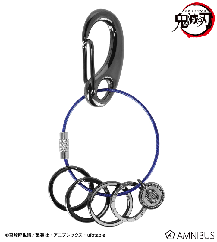 ガンメタリックカラーを基調としたパーツとキャラクターイメージカラーのワイヤーリング、冨岡義勇の名前が刻印されたリングとモチーフデザインのチャームを組み合わせています。