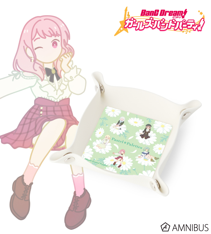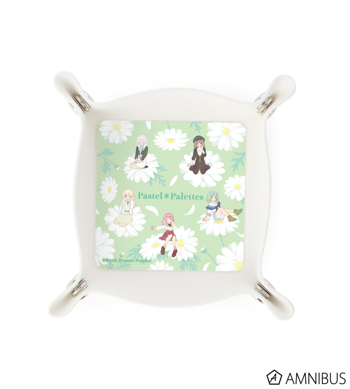 丸山 彩、氷川 日菜、白鷺 千聖、大和 麻弥、若宮 イヴのイラストをボタニカルデザインに落とし込んで繊細なタッチで新たに描き起こし、PUレザーマルチトレーに仕上げました。