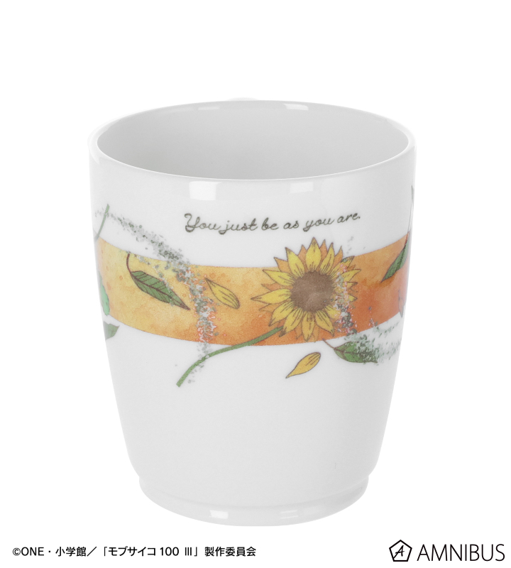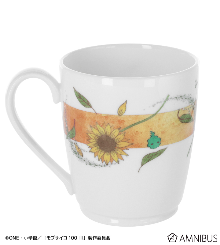 霊幻新隆をイメージした、最終話に登場する花とキャラカラーのオレンジ色が印象的でカジュアルなマグカップです。