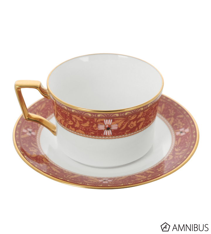 赤と金の2色で作品の世界観を表現し、ノリタケの美しい白磁にカップ淵、取手、ソーサー淵の金が輝く、高級感漂う一品に仕上げました。