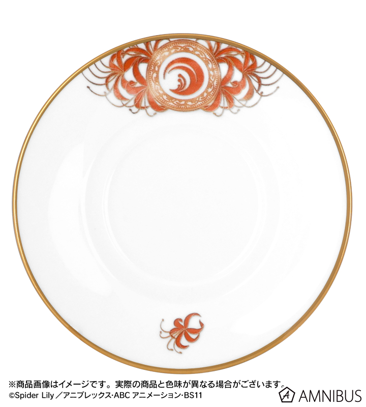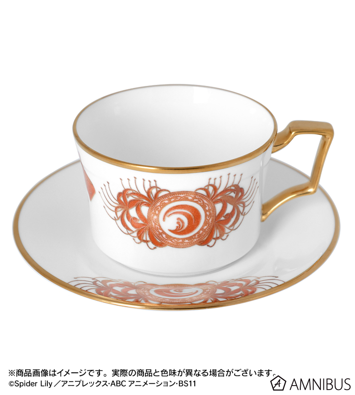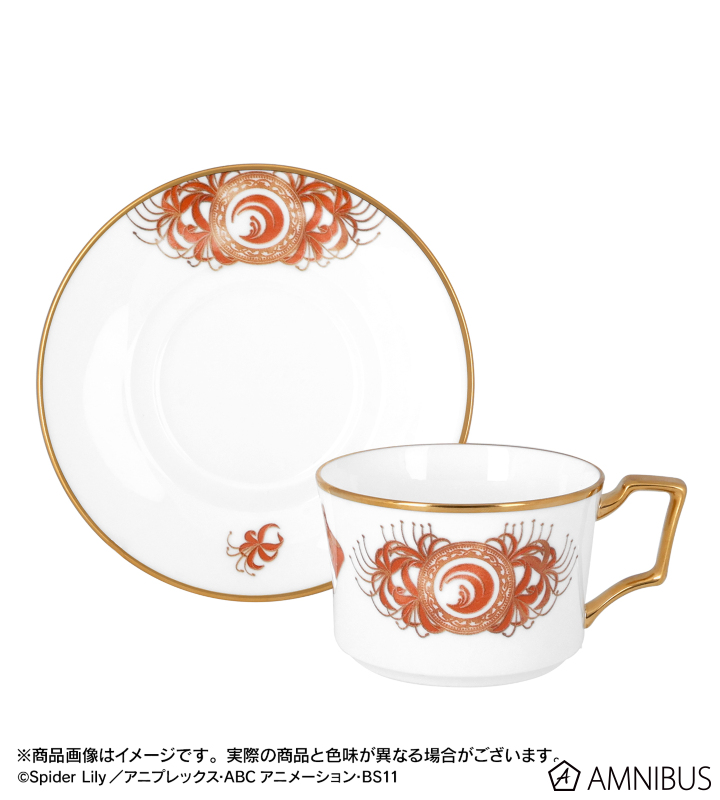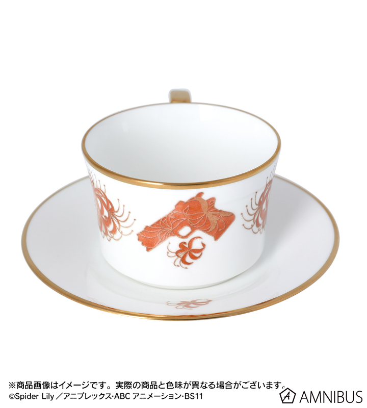 リコリスマーク、彼岸花が特徴的な錦木千束をモチーフにした高級感のあるカップ&ソーサーです。