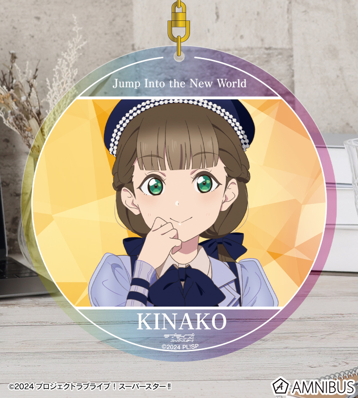 桜小路きな子のJump Into the New World衣装イラスト、メンバー名、楽曲名をオーロラBIGアクリルキーホルダーに仕上げました。