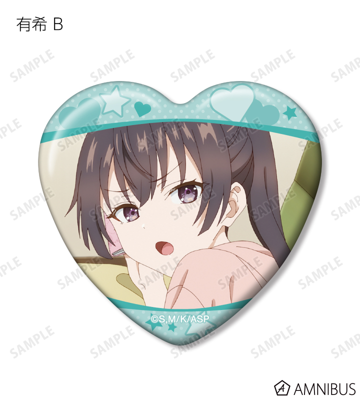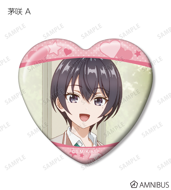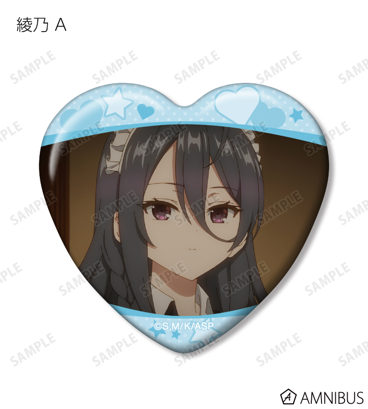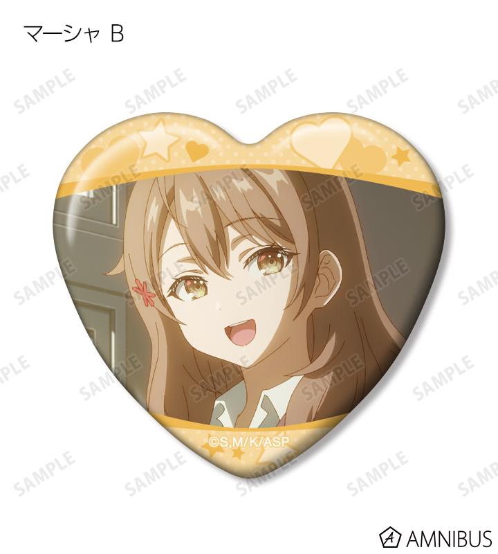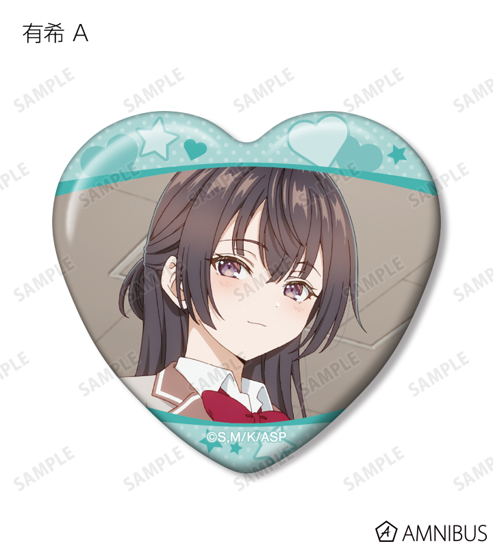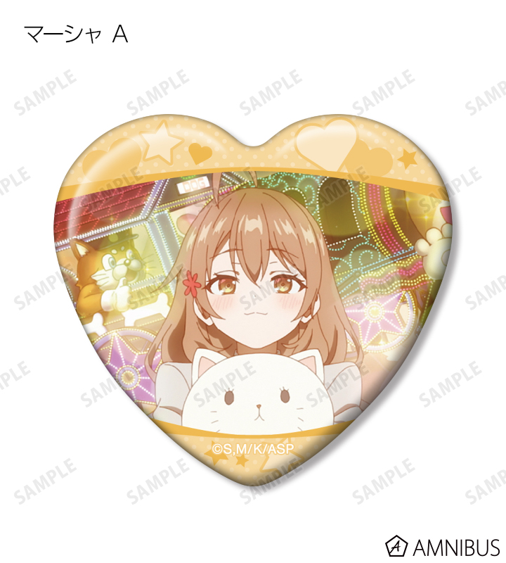 アーリャ、有希、マーシャ、綾乃、茅咲の印象的なシーンをハート型の缶バッジに仕上げました。