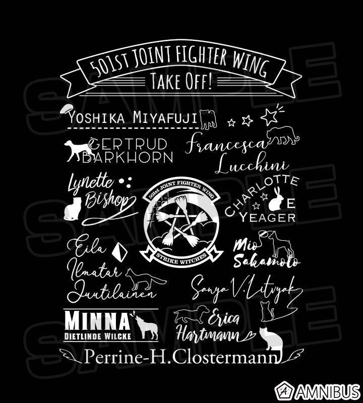 ウィッチの名前や使い魔のモチーフ、501部隊のロゴマークをレイアウトし、線画をメインとしたデザインで表現しました。