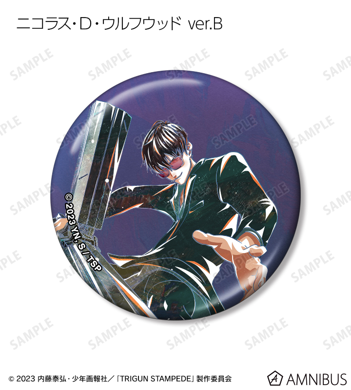 ヴァッシュ・ザ・スタンピード、ニコラス・D・ウルフウッド、ミリオンズ・ナイヴズのビジュアルを新たなタッチで魅力的に表現し、メタリック仕様の缶バッジに仕上げました。