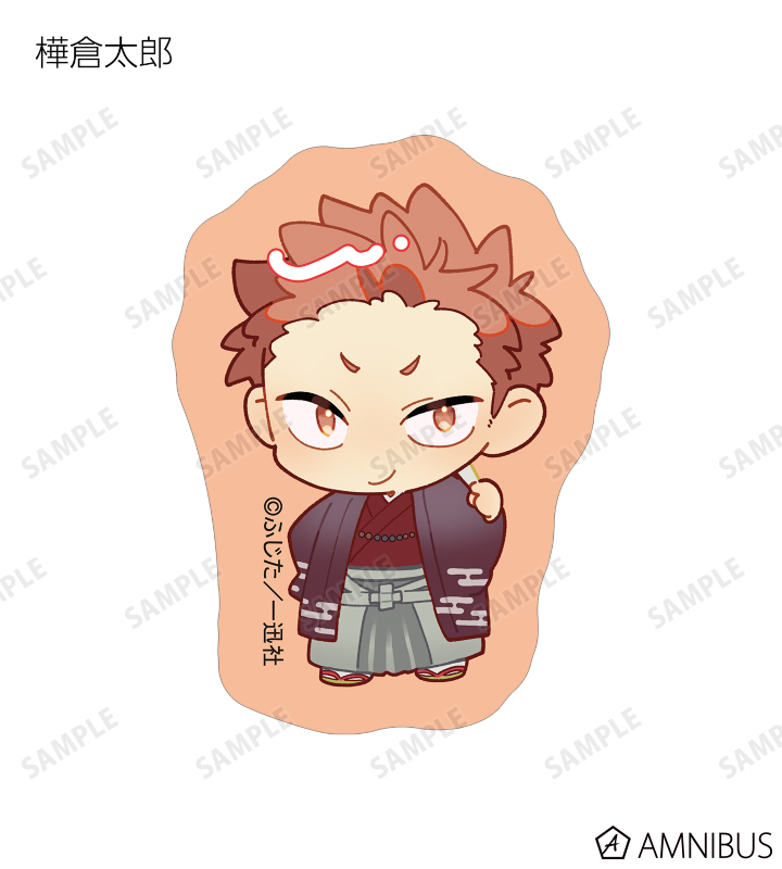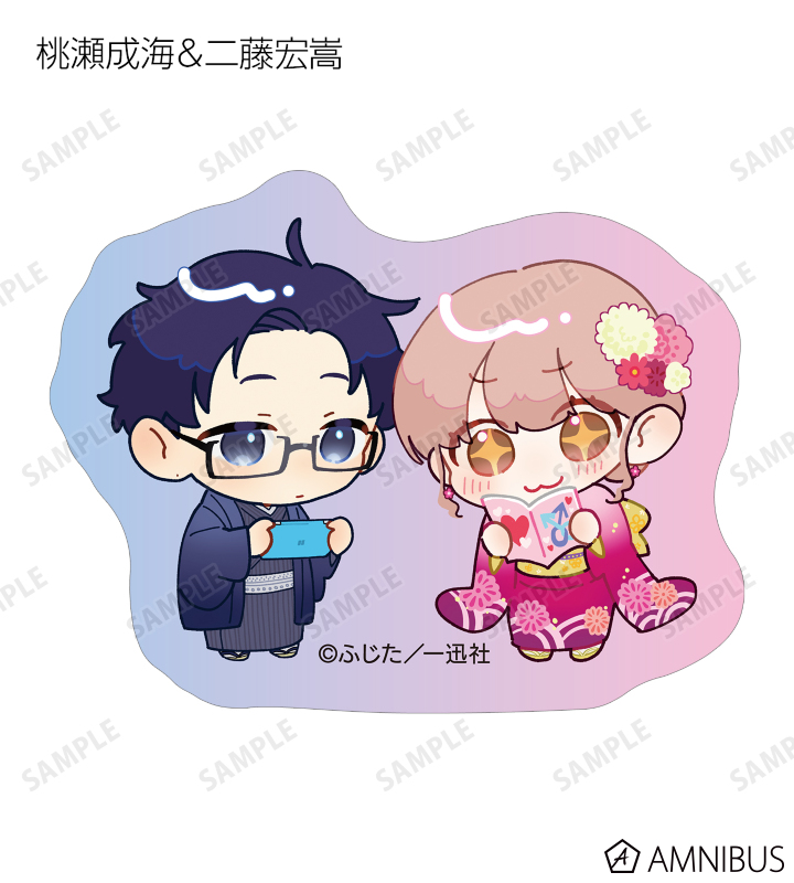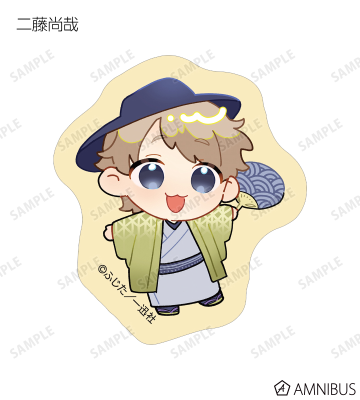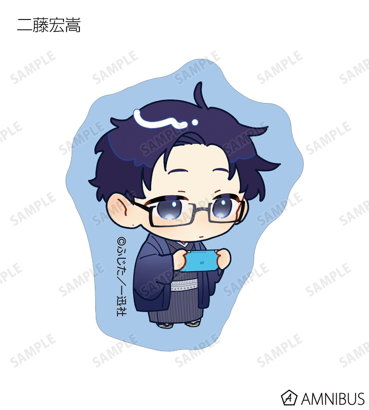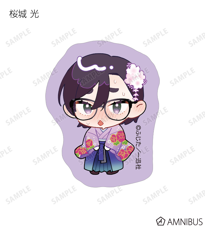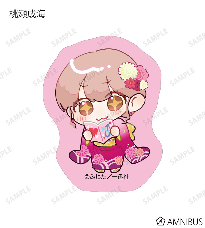 ふじた先生の描き下ろしちびキャライラストの桃瀬成海、二藤宏嵩、小柳花子、樺倉太郎、二藤尚哉、桜城 光をフレークシールに仕上げました。
