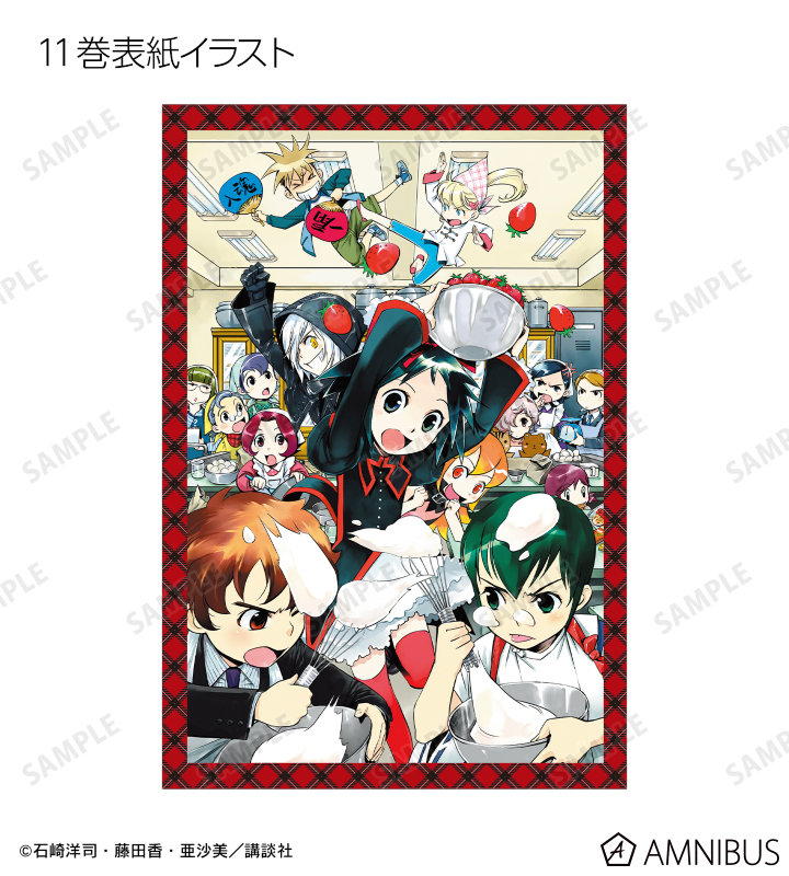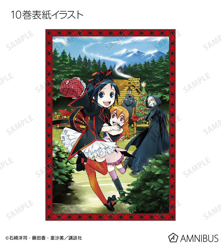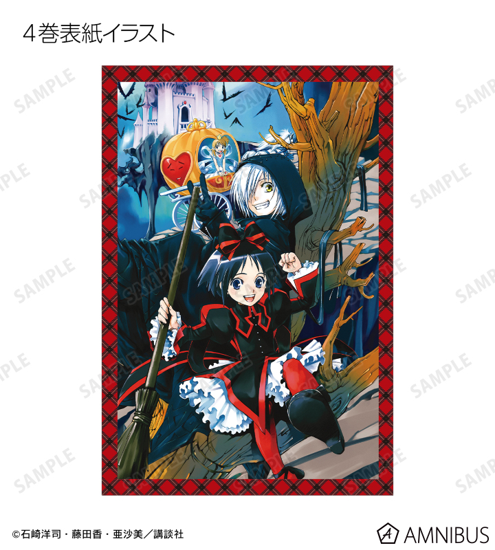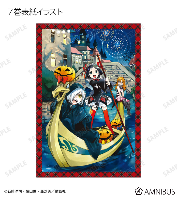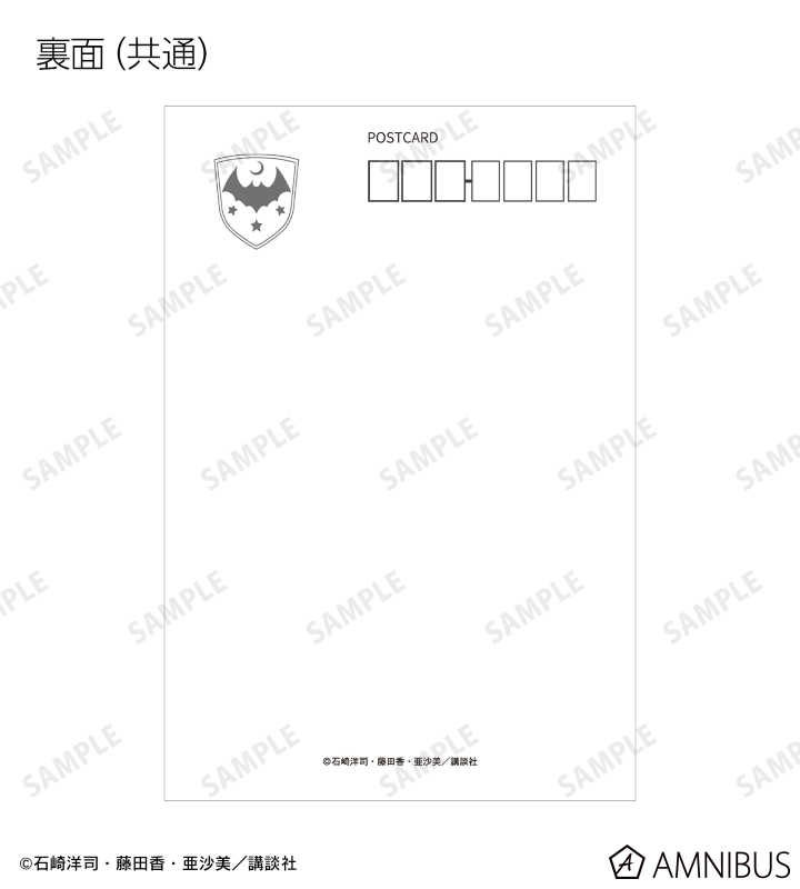 4巻表紙イラスト、7巻表紙イラスト、10巻表紙イラスト、11巻表紙イラスト、16巻表紙イラスト、王立魔女学校校章をポストカード5枚セットに仕上げました。