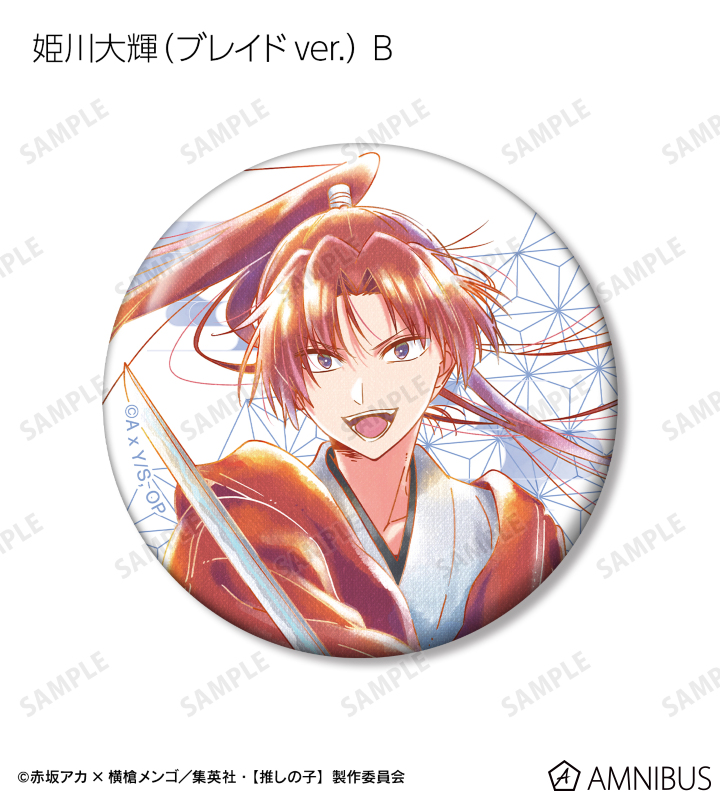 姫川大輝(ブレイドver.)、有馬かな(ツルギver.)、鳴嶋メルト(キザミver.)、黒川あかね(鞘姫ver.)、アクア(刀鬼ver.)、鴨志田朔夜(匁ver.)のイラストを新たなタッチで魅力的に表現し、作中で登場する舞台をイメージしたデザインの缶バッジに仕上げました。