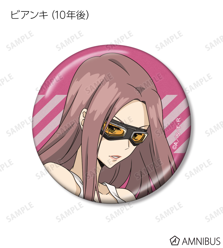 沢田 綱吉、リボーン、獄寺 隼人、ビアンキ(10年後)、山本 武、スペルビ・スクアーロ(10年後)、雲雀 恭弥、ディーノ(10年後)、六道 骸(10年後)、フランをメタリック仕様の缶バッジに仕上げました。