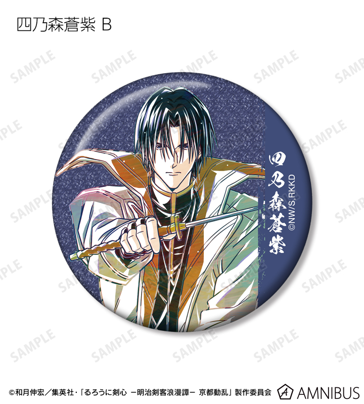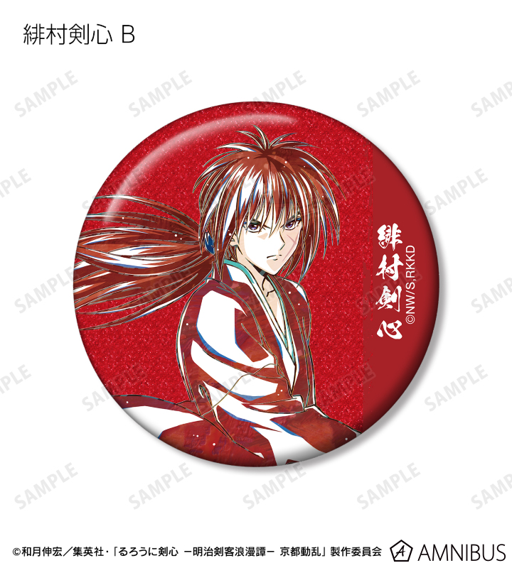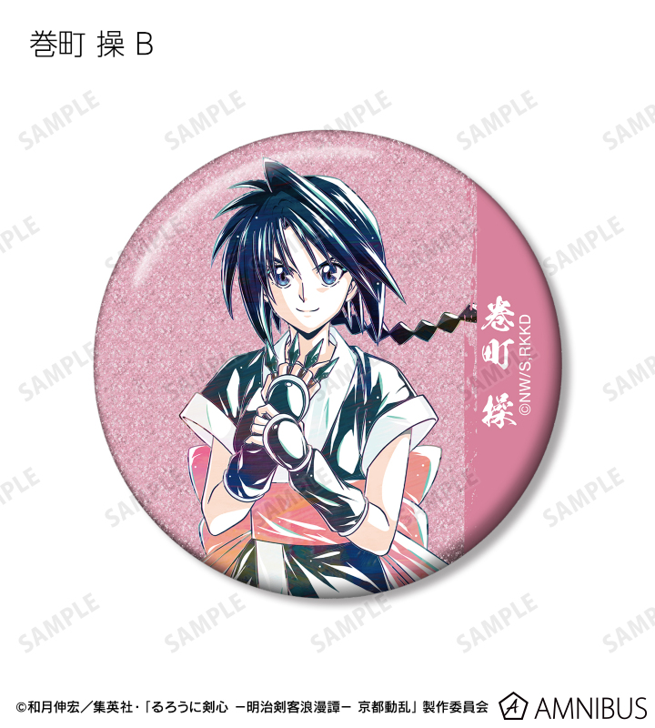 緋村剣心、相楽左之助、斎藤 一、巻町 操、四乃森蒼紫、瀬田宗次郎、志々雄真実のイラストを新たなタッチで魅力的に表現し、グリッター加工を施した缶バッジに仕上げました。