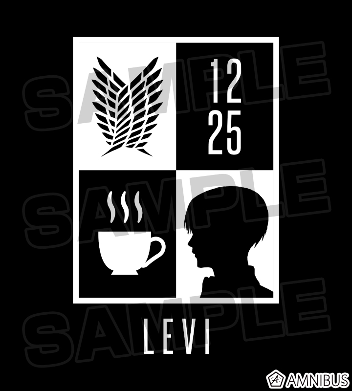 リヴァイの横顔のシルエットや誕生日、カップ、自由の翼などのモチーフをフレーミングしたデザインに仕上げました。