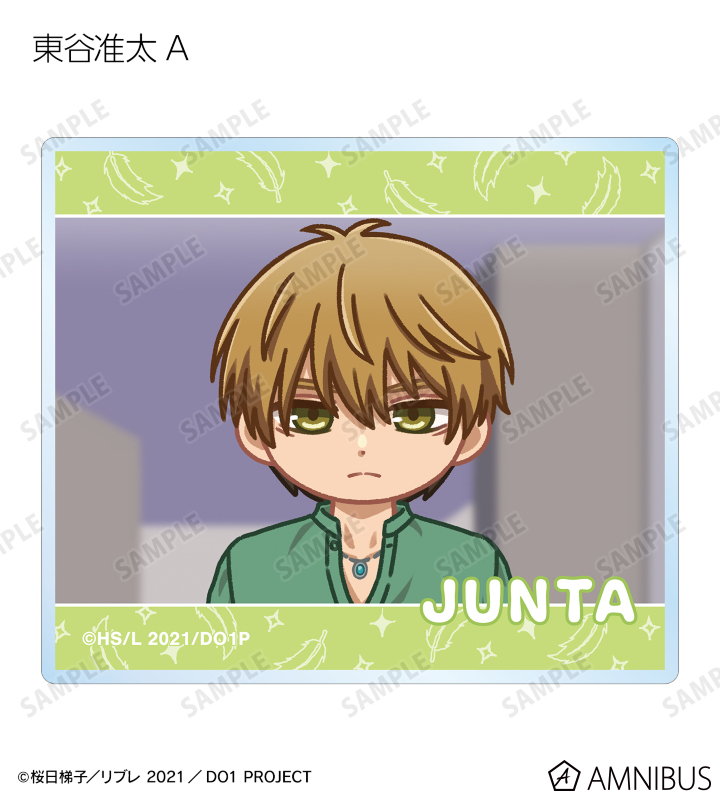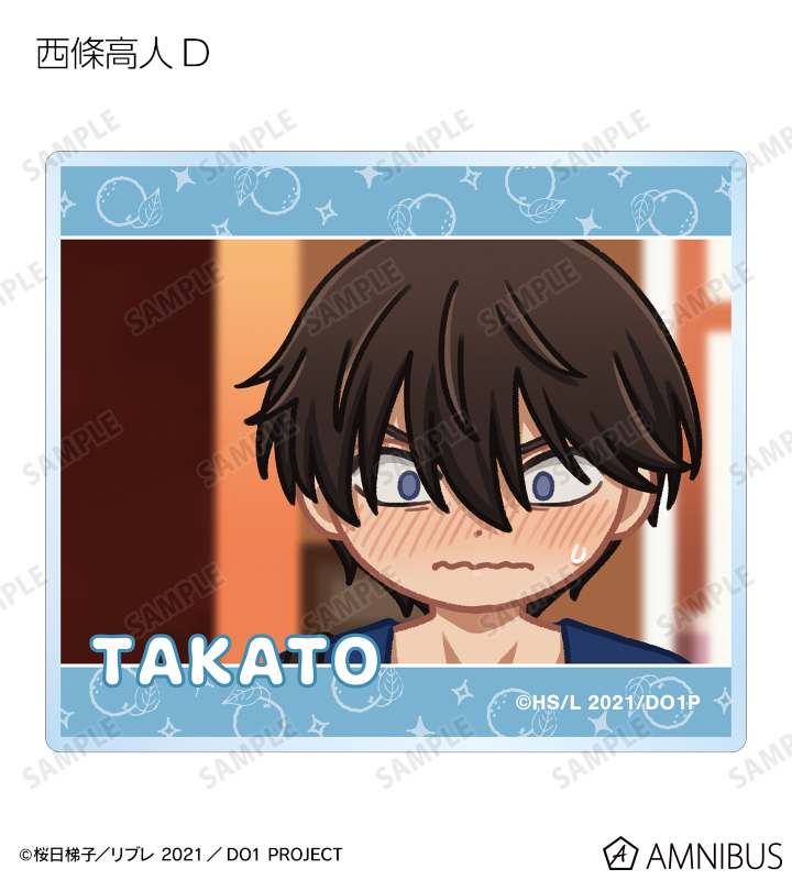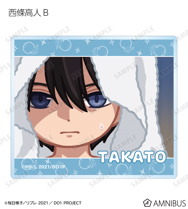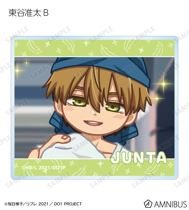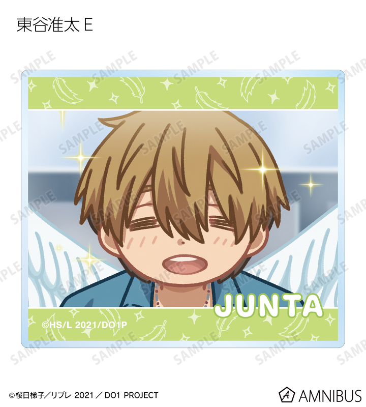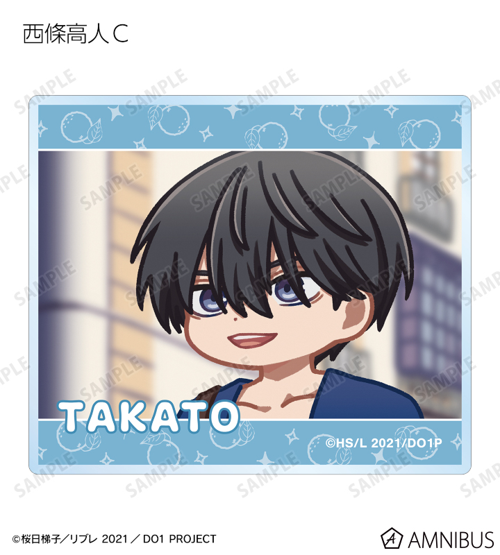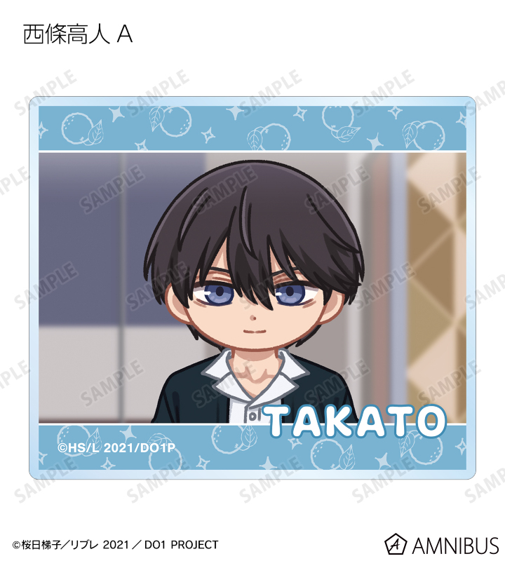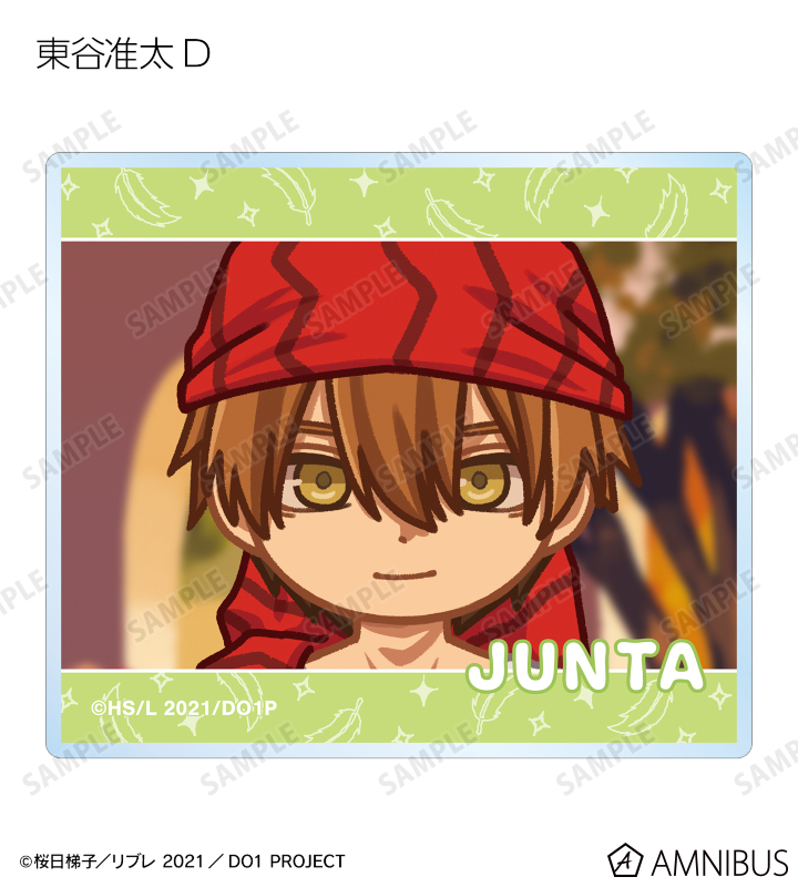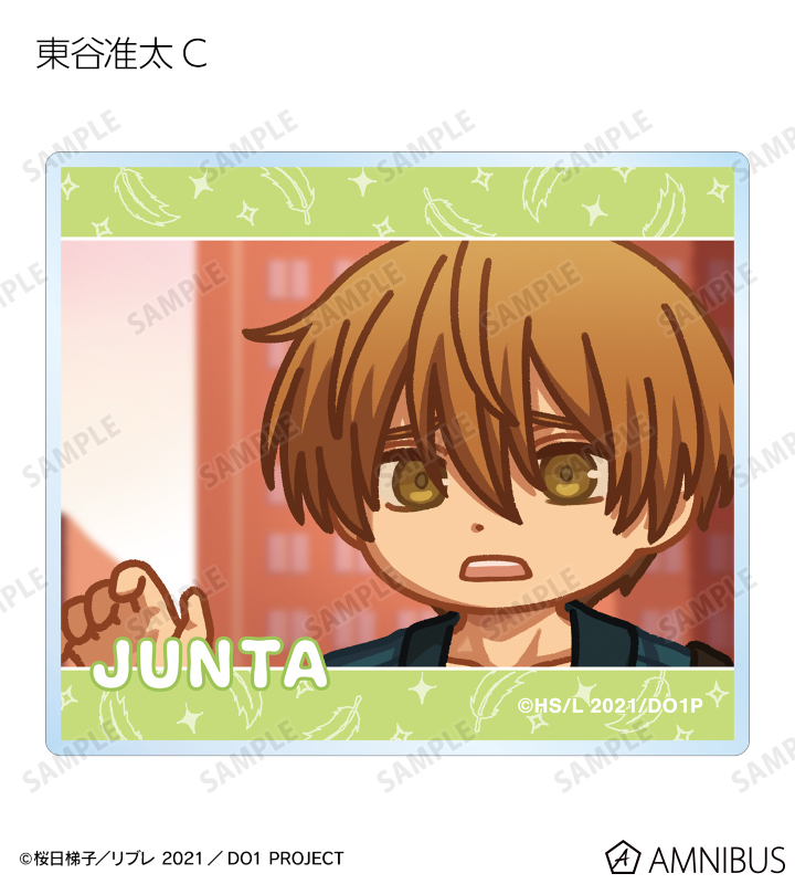 東谷准太、西條高人の印象的なシーンのゆるコマイラストと東谷准太モチーフの羽根、西條高人モチーフのオレンジをアクリルカードに仕上げました。