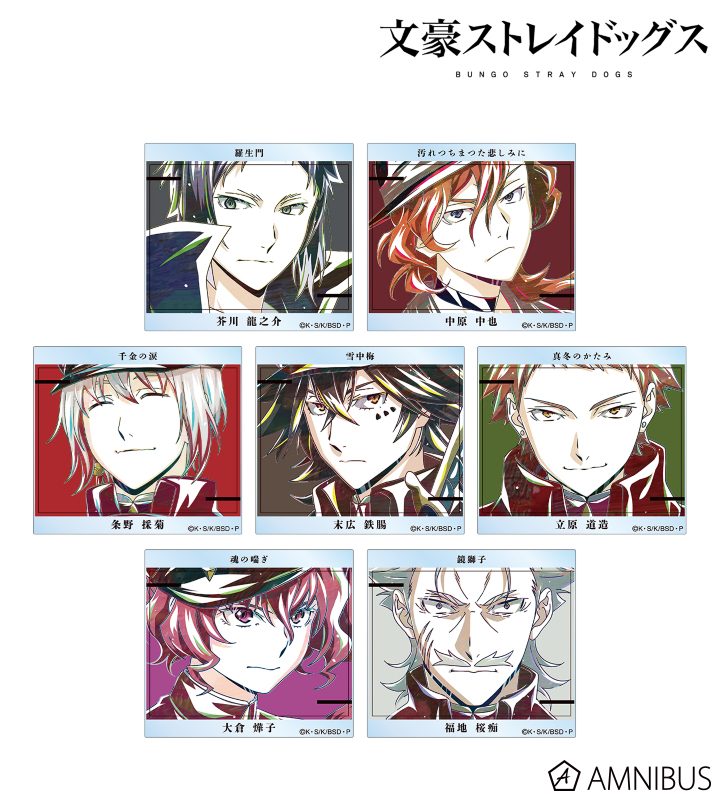 芥川龍之介、中原中也、条野採菊、末広鉄腸、立原道造、大倉燁子、福地桜痴のイラストを新たなタッチで魅力的に表現し、異能力名と組み合わせたアクリルカードに仕上げました。