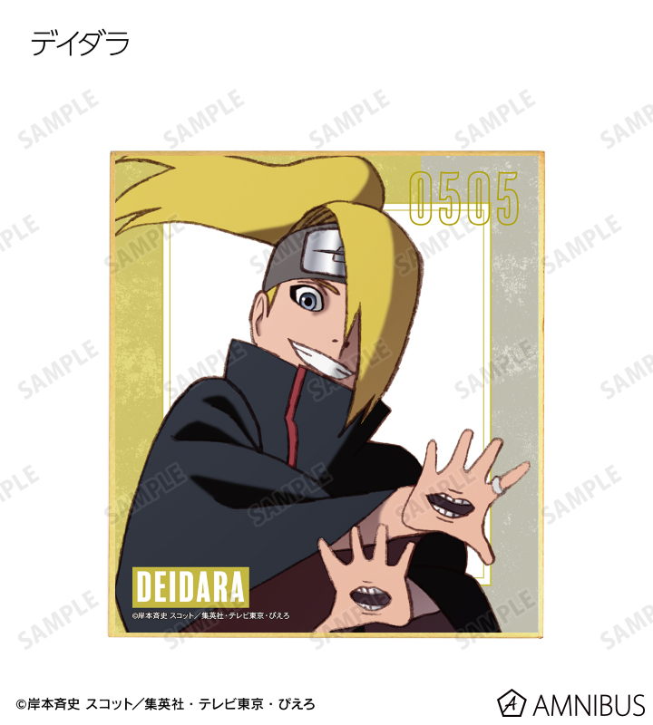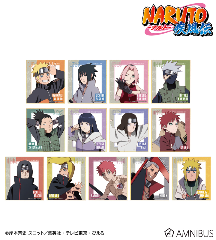 うずまきナルト、うちはサスケ、春野サクラ、はたけカカシ、奈良シカマル、日向ヒナタ、日向ネジ、我愛羅、うちはイタチ、デイダラ、サソリ、飛段、波風ミナトのイラストをミニ色紙に仕上げました。