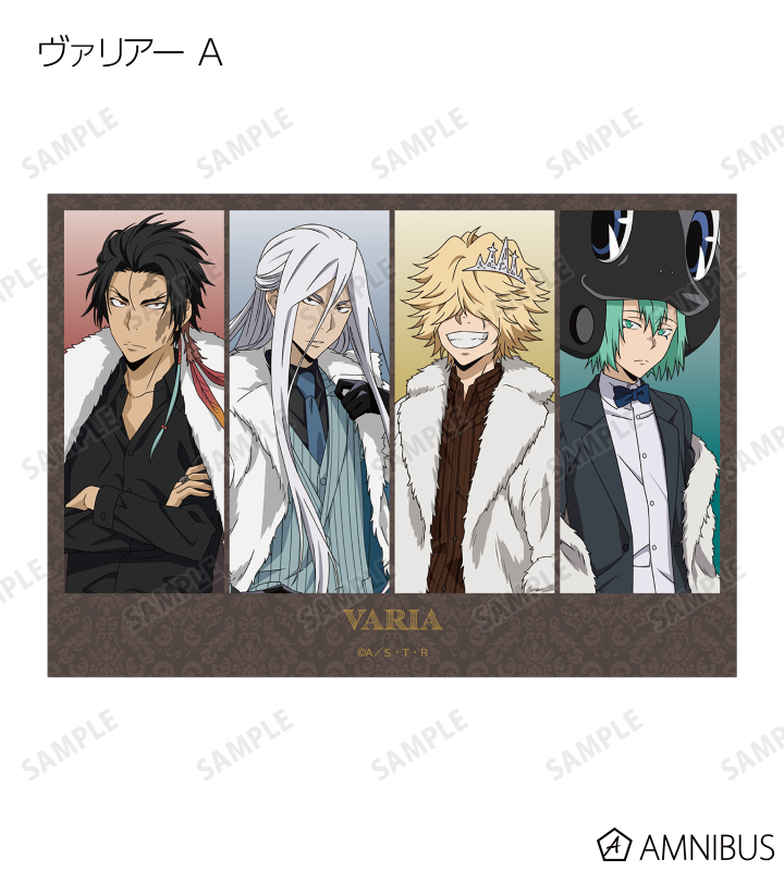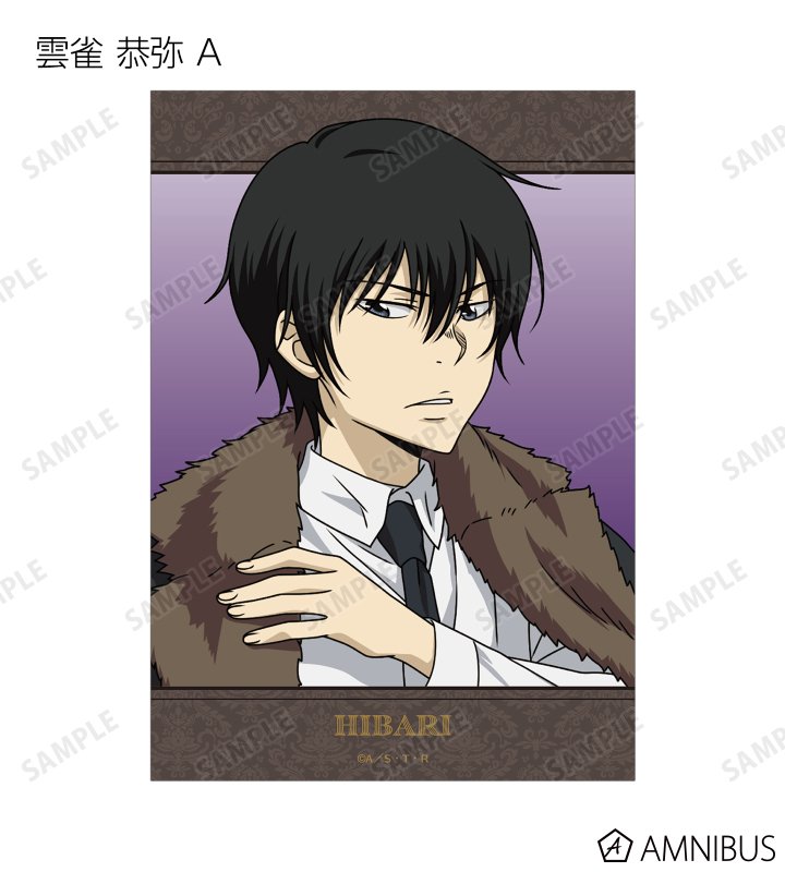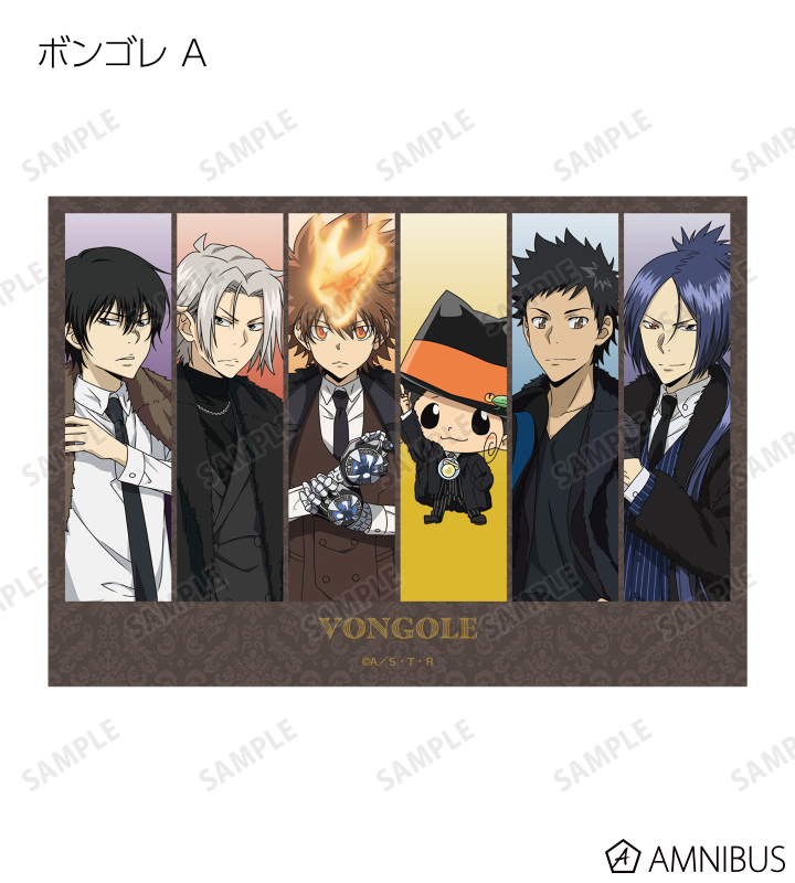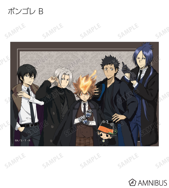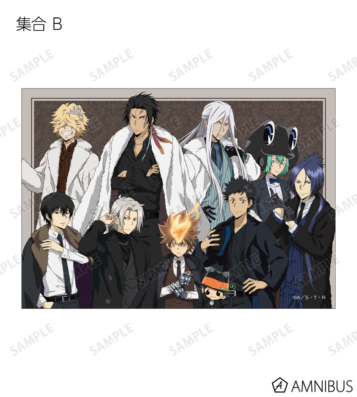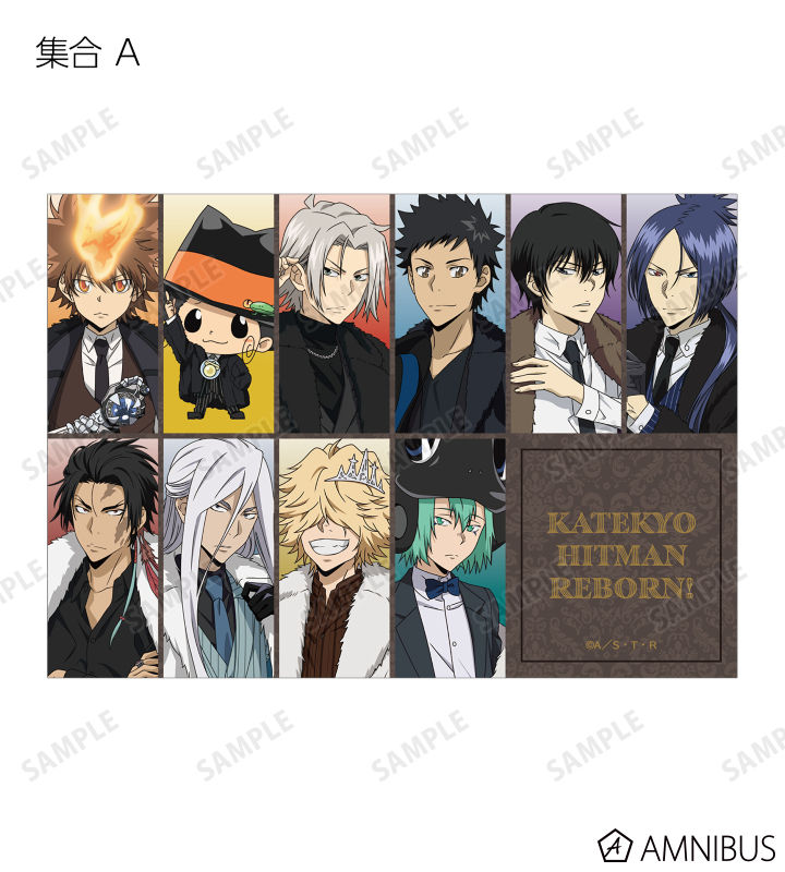 沢田 綱吉、リボーン、獄寺 隼人、山本 武、雲雀 恭弥、六道 骸(10年後)、XANXUS(10年後)、スペルビ・スクアーロ(10年後)、ベルフェゴール(10年後)、フランの描き下ろしイラストをブロマイドに仕上げました。