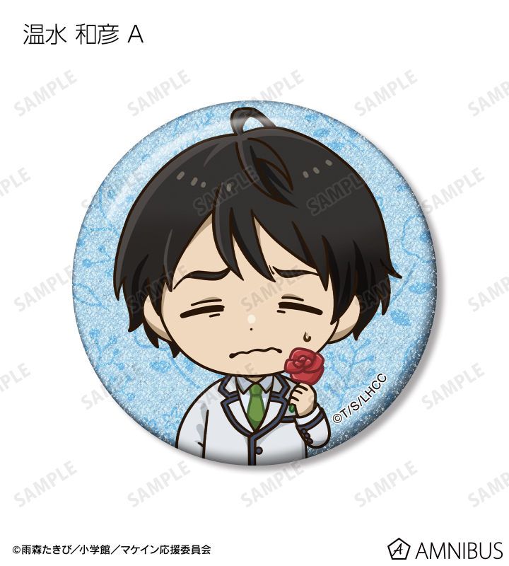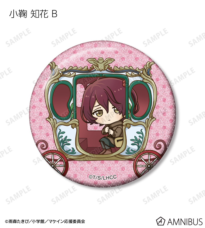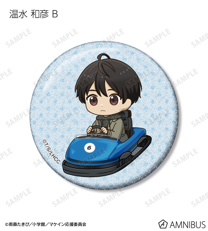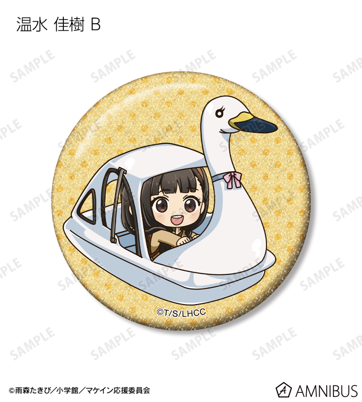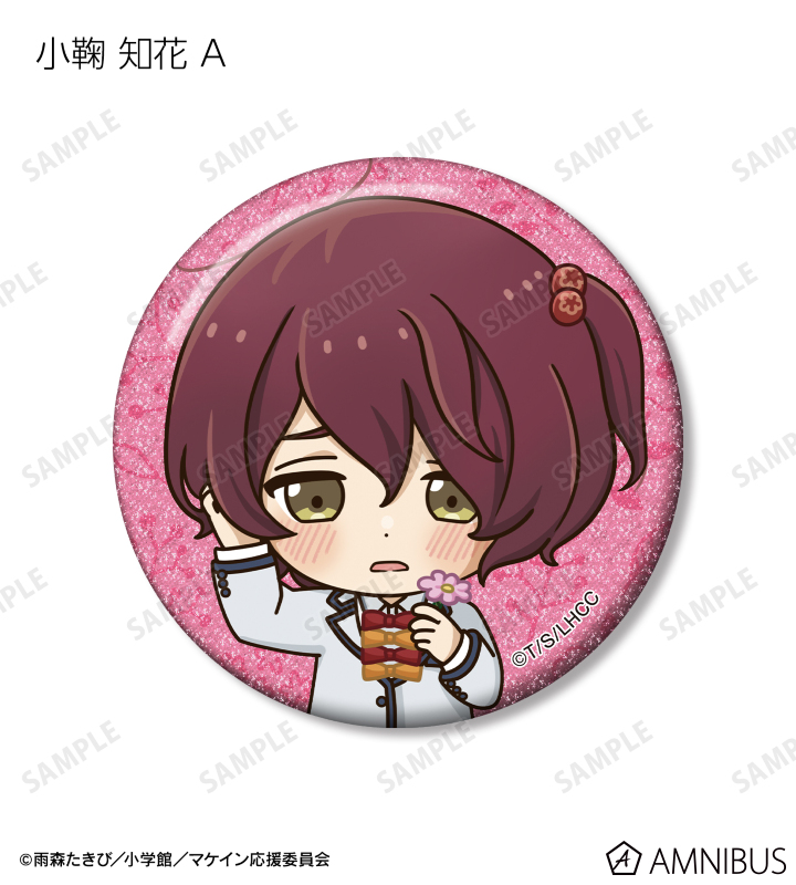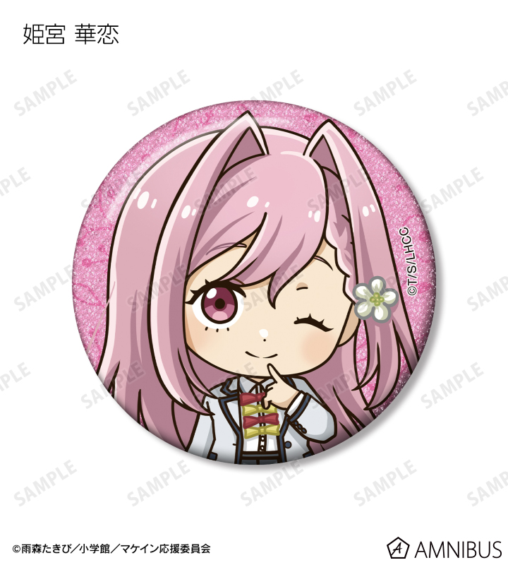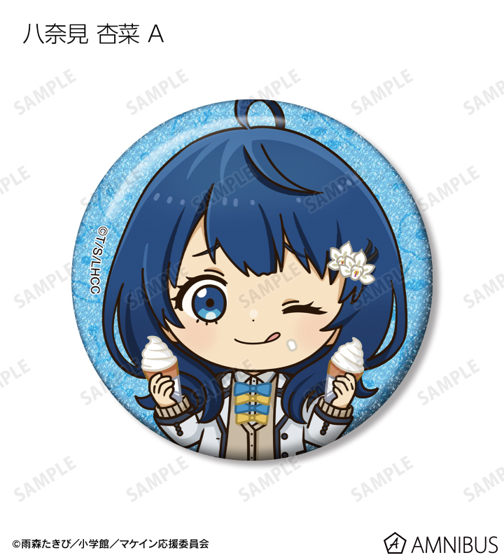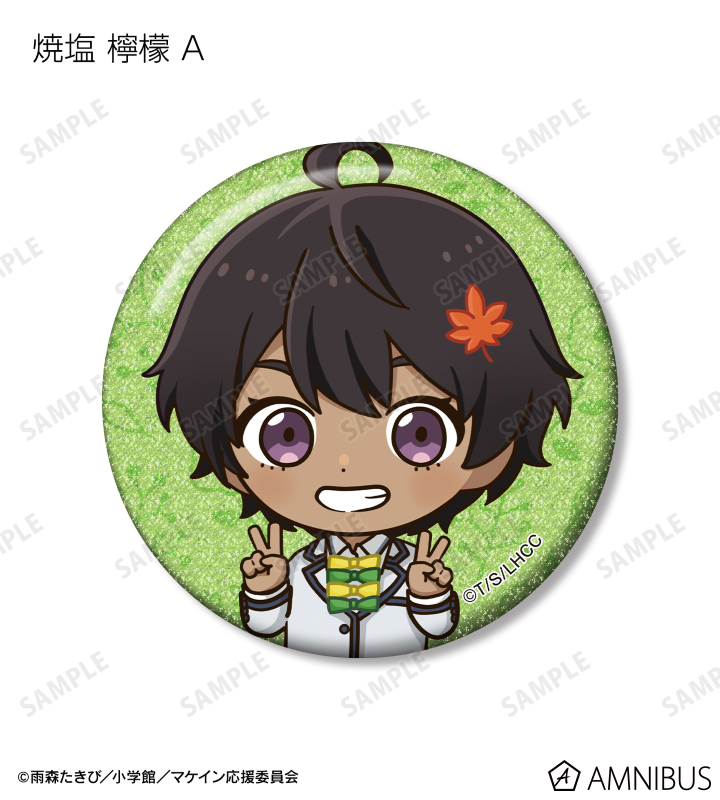 温水 和彦、八奈見 杏菜、焼塩 檸檬、小鞠 知花、温水 佳樹、月之木 古都、姫宮 華恋、朝雲 千早、志喜屋 夢子、放虎原 ひばり、馬剃 天愛星の描き起こしちびキャライラストをメインにデザインし、グリッター加工を施した缶バッジに仕上げました。