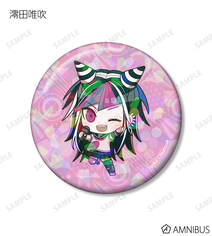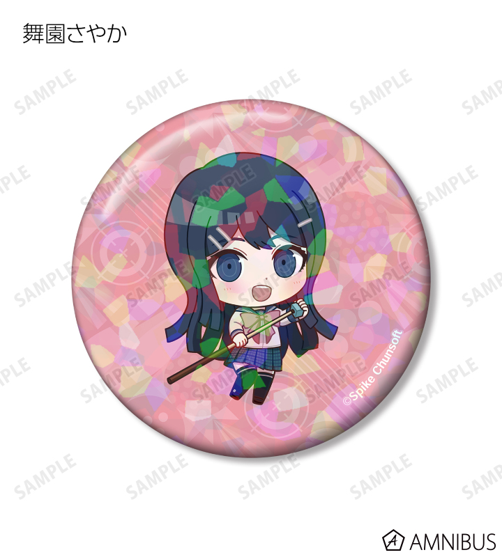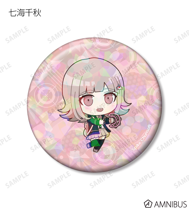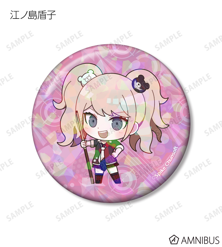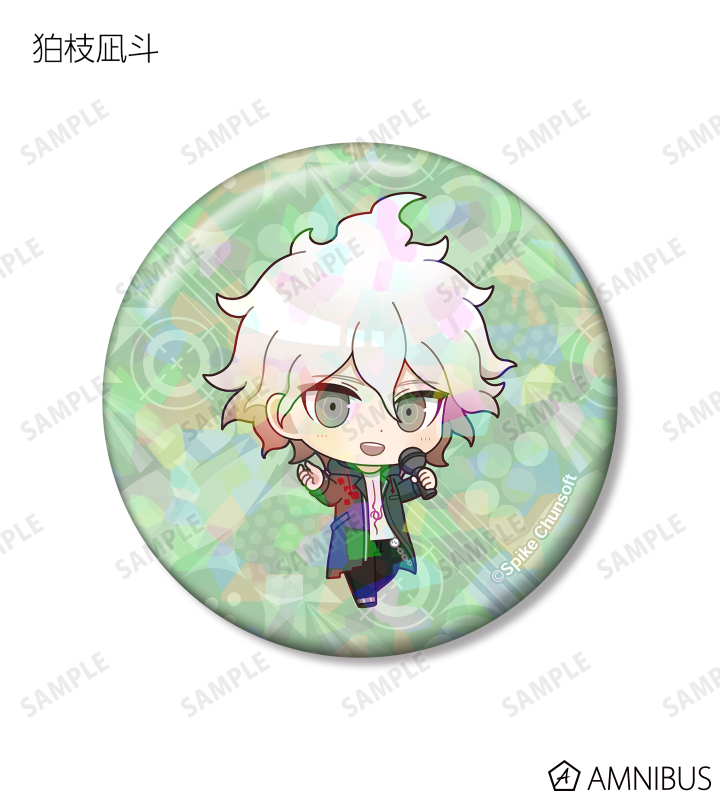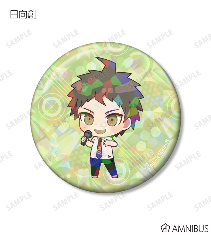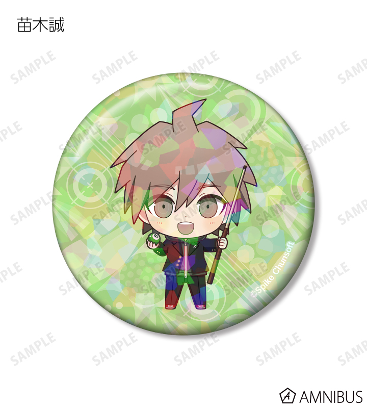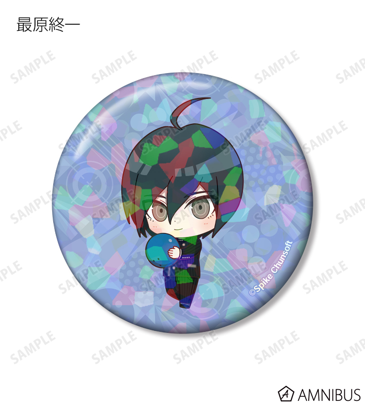 苗木誠、舞園さやか、霧切響子、江ノ島盾子、日向創、狛枝凪斗、七海千秋、澪田唯吹、赤松楓、王馬小吉、キーボ、最原終一の描き起こしちびキャライラストをメインにデザインし、ホログラム加工を施した缶バッジに仕上げました。