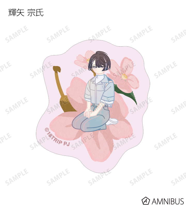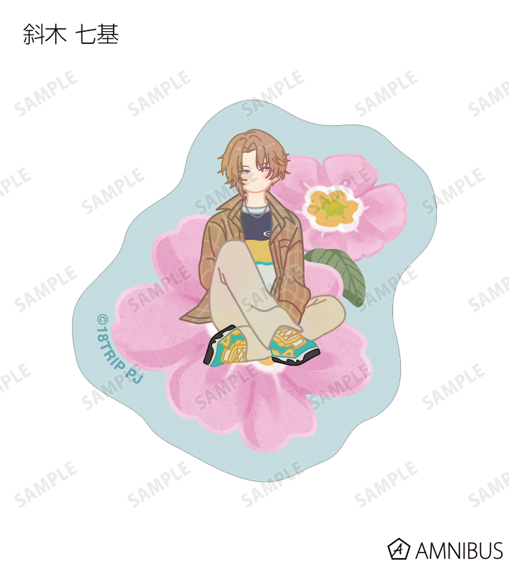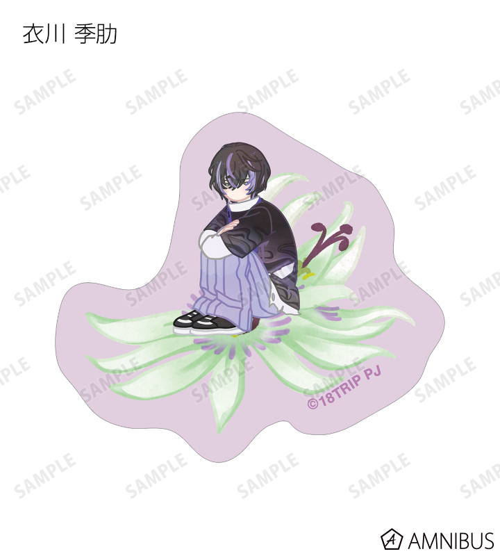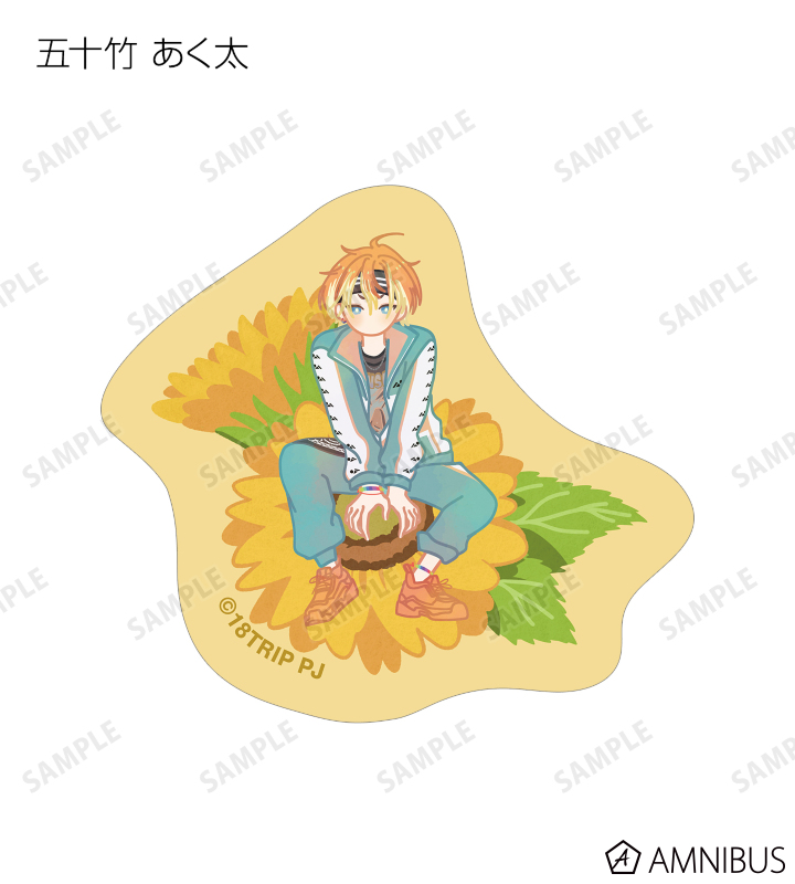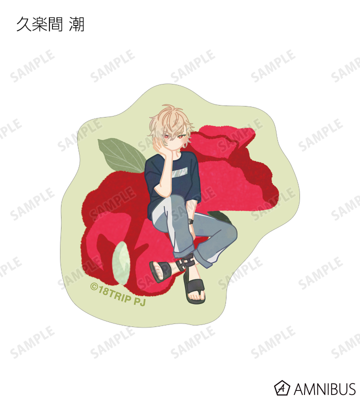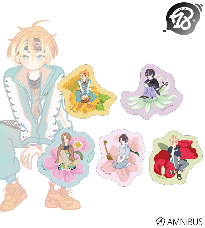 五十竹 あく太、衣川 季肋、斜木 七基、輝矢 宗氏、久楽間 潮のイラストをボタニカルデザインに落とし込んで繊細なタッチで新たに描き起こし、フレークシールに仕上げました。