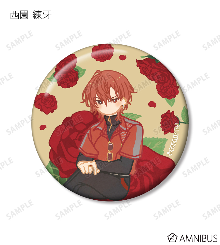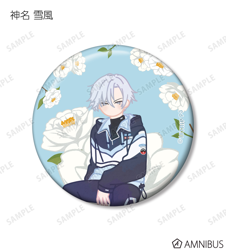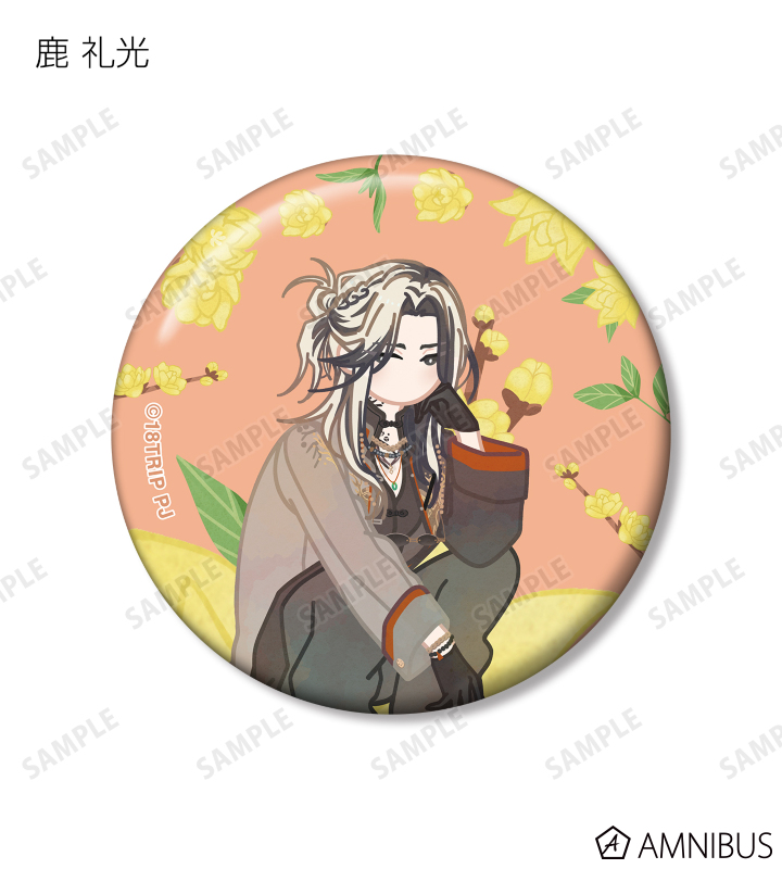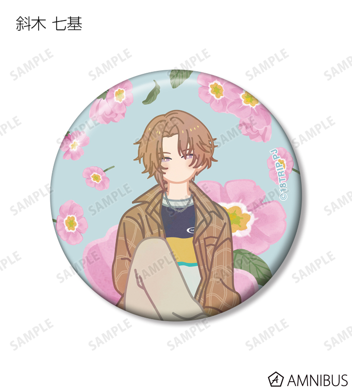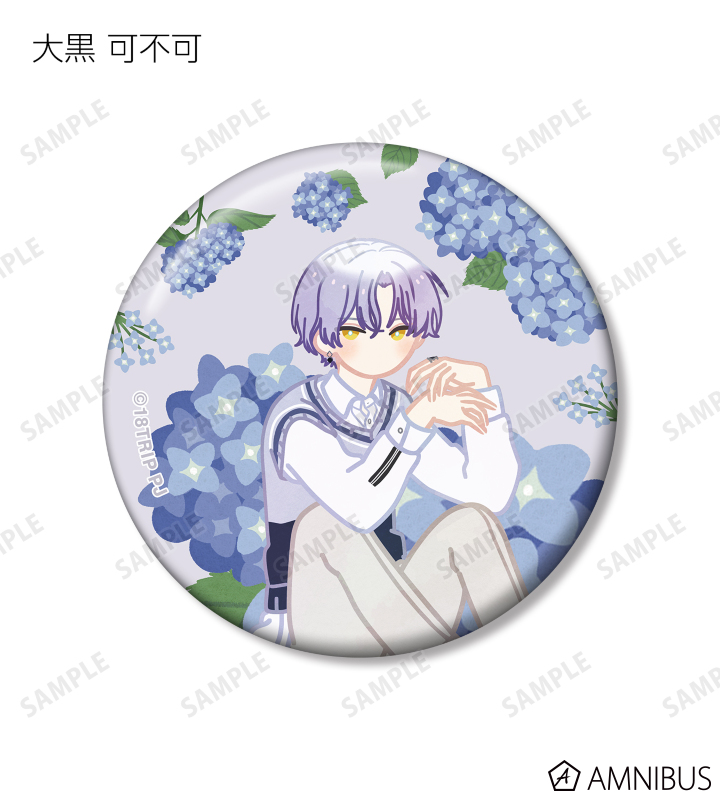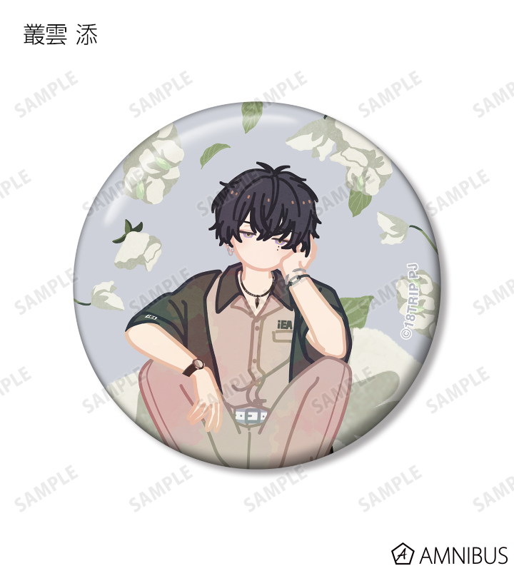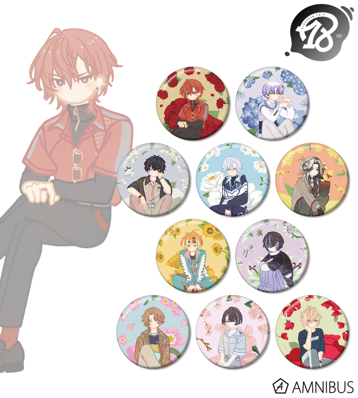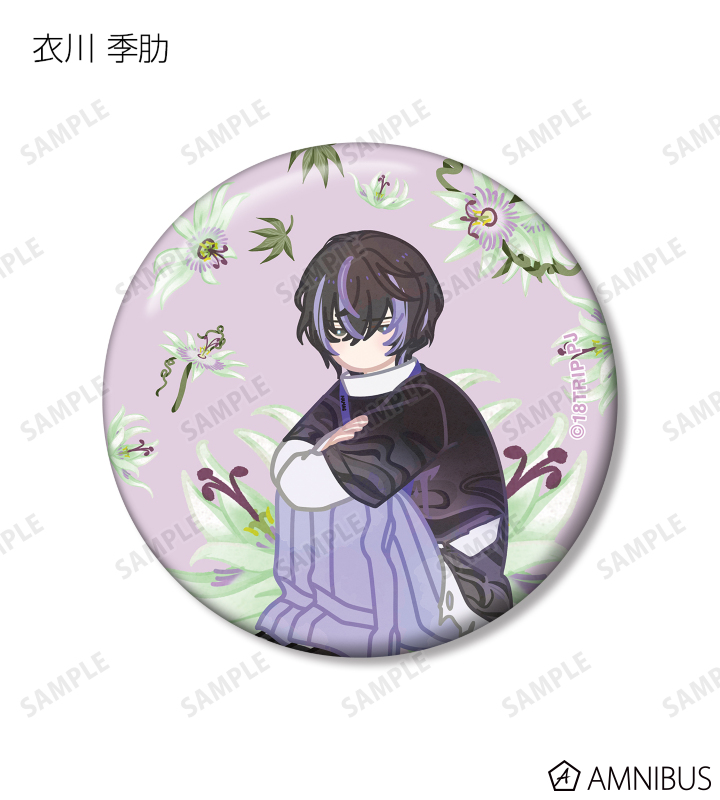 西園 練牙、大黒 可不可、叢雲 添、神名 雪風、鹿 礼光、五十竹 あく太、衣川 季肋、斜木 七基、輝矢 宗氏、久楽間 潮のイラストをボタニカルデザインに落とし込んで繊細なタッチで新たに描き起こし、缶バッジに仕上げました。