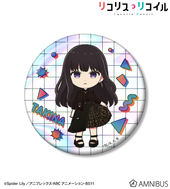 TVアニメ「リコリス・リコイル」×「meagratia」のコラボレーションアイテム「meagratiaコラボ 井ノ上たきな ちびキャラ 75mmオーロラ缶バッジ ver.A」の登場です。
