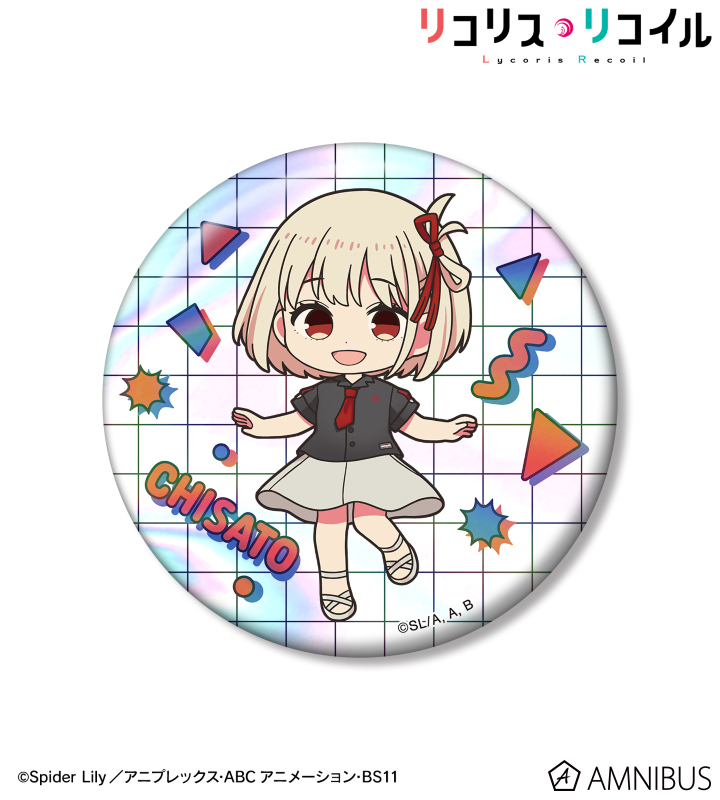 TVアニメ「リコリス・リコイル」×「meagratia」のコラボレーションアイテム「meagratiaコラボ 錦木千束 ちびキャラ 75mmオーロラ缶バッジ ver.B」の登場です。