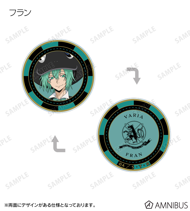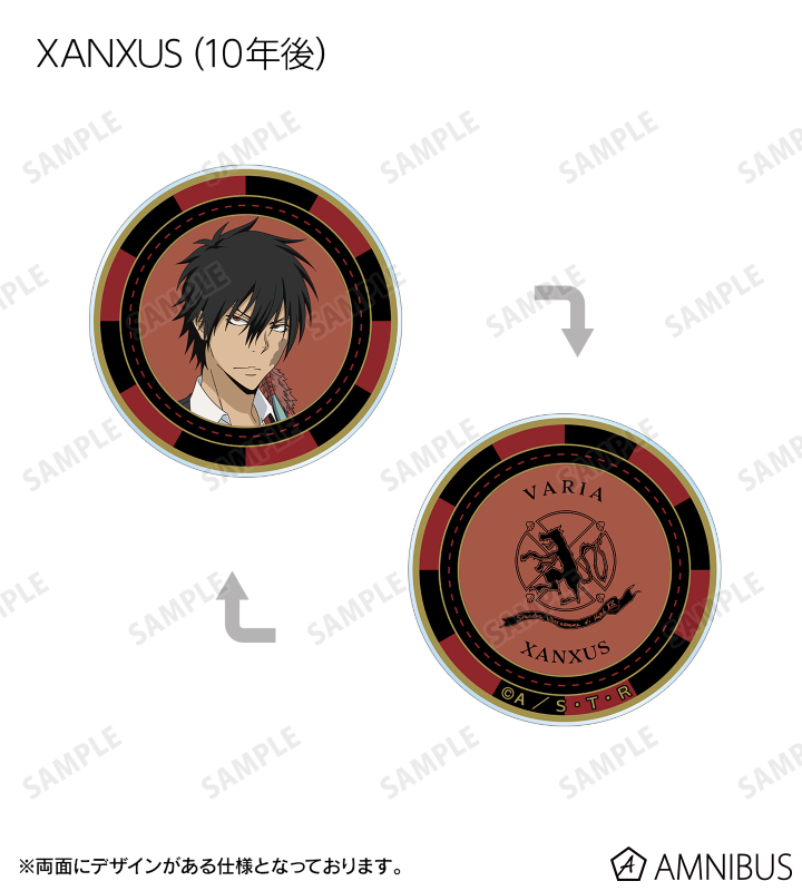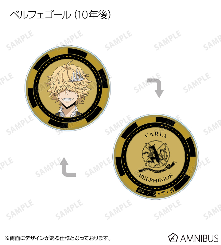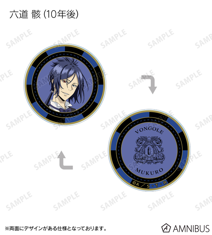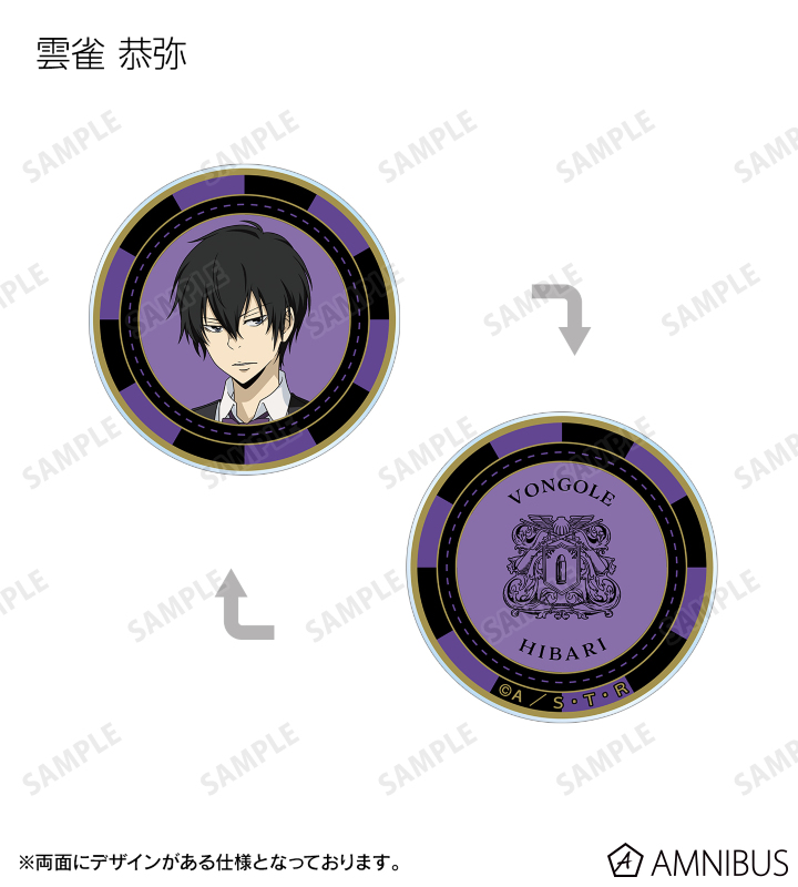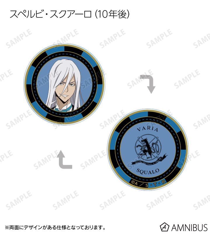 沢田 綱吉、リボーン、雲雀 恭弥、六道 骸(10年後)、XANXUS (10年後)、スペルビ・スクアーロ(10年後)、ベルフェゴール(10年後)、フランの描き下ろしイラストをデザインした、アクリル製のカジノチップです。