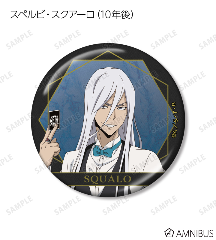 沢田 綱吉、リボーン、雲雀 恭弥、六道 骸(10年後)、XANXUS (10年後)、スペルビ・スクアーロ(10年後)、ベルフェゴール(10年後)、フランの描き下ろしイラストをメタリック仕様の缶バッジに仕上げました。