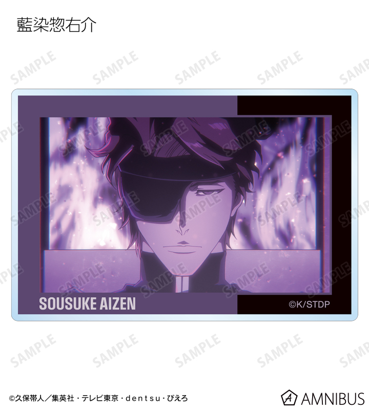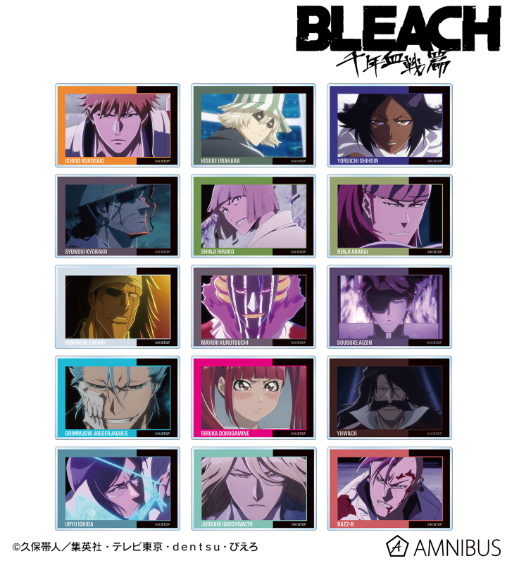 黒崎一護、浦原喜助、四楓院夜一、京楽春水、平子真子、阿散井恋次、更木剣八、涅マユリ、藍染惣右介、グリムジョー・ジャガージャック、毒ヶ峰リルカ、ユーハバッハ、石田雨竜、ユーグラム・ハッシュヴァルト、バズビーの印象的なシーンをアクリルカードに仕上げました。
