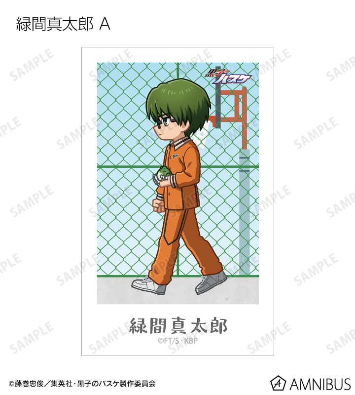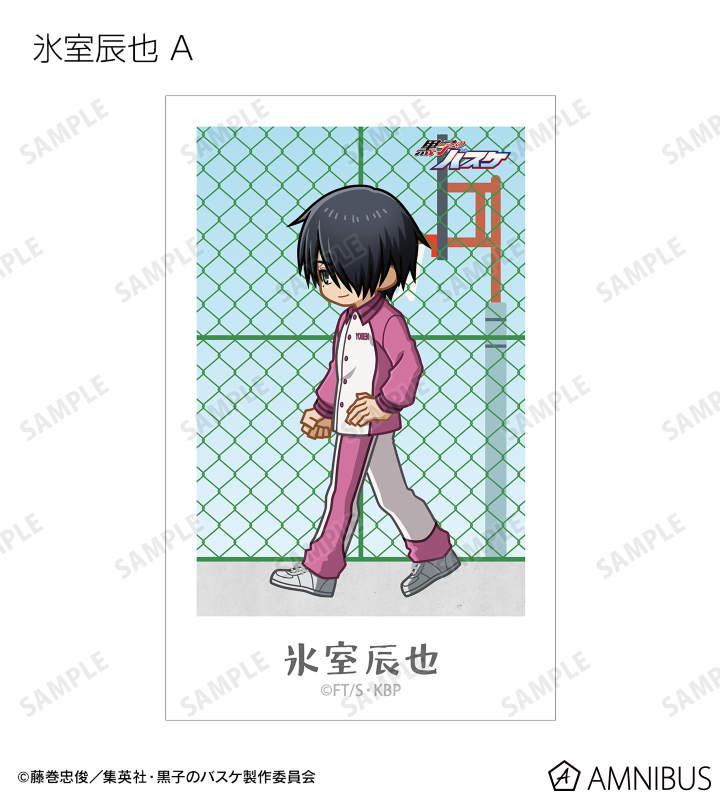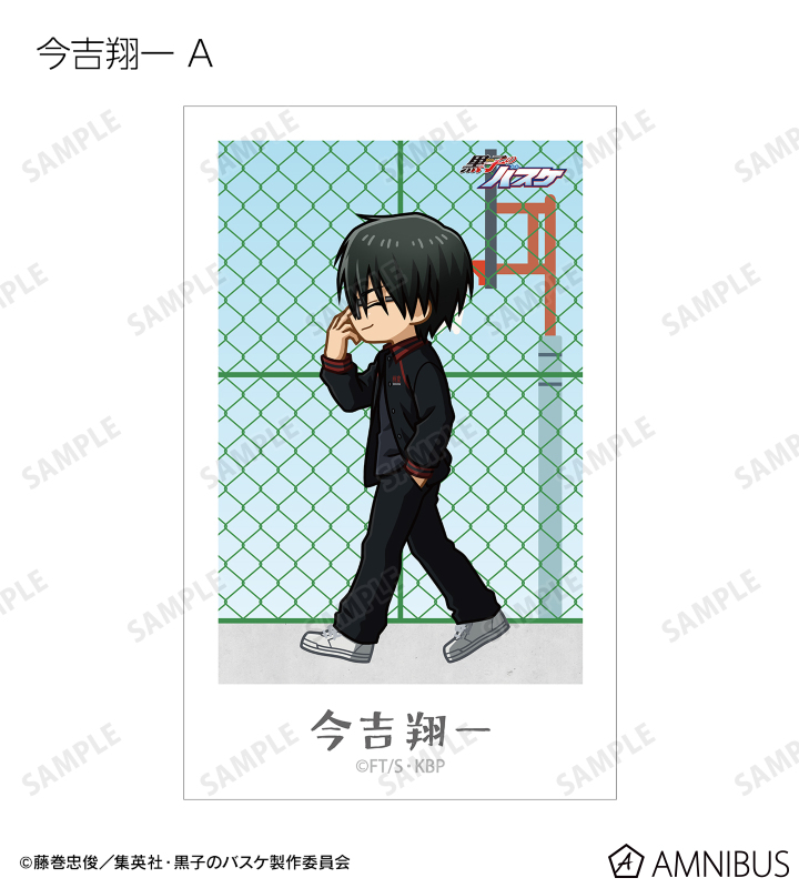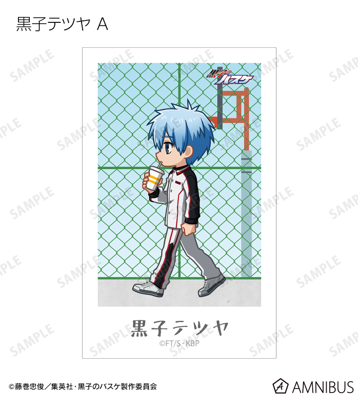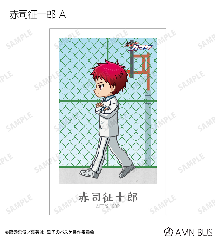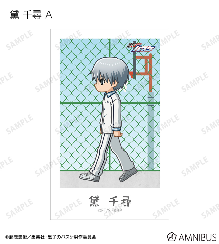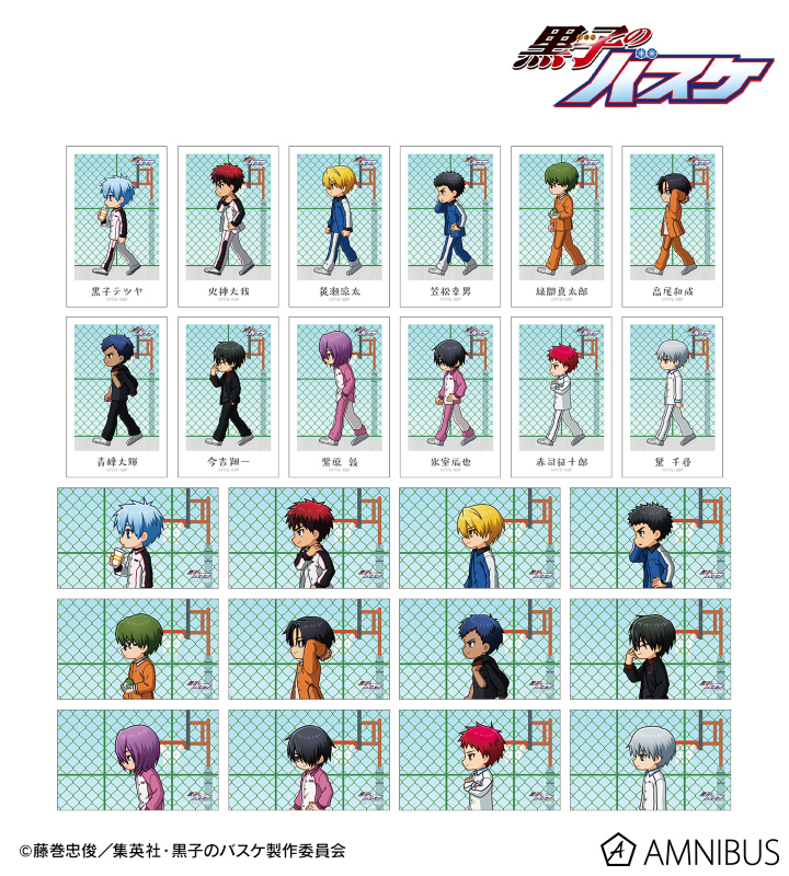 黒子テツヤ、火神大我、黄瀬涼太、笠松幸男、緑間真太郎、高尾和成、青峰大輝、今吉翔一、紫原 敦、氷室辰也、赤司征十郎、黛 千尋が歩いているちびキャラを新たに描き起こし、イラストカードに仕上げました。