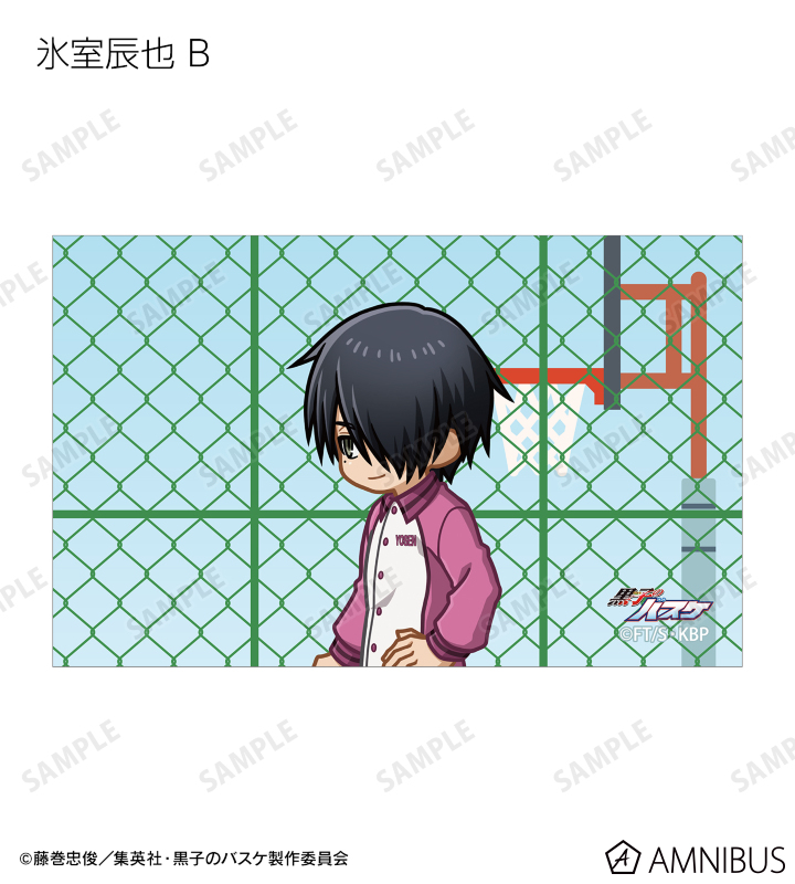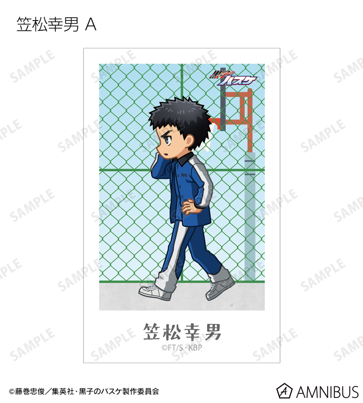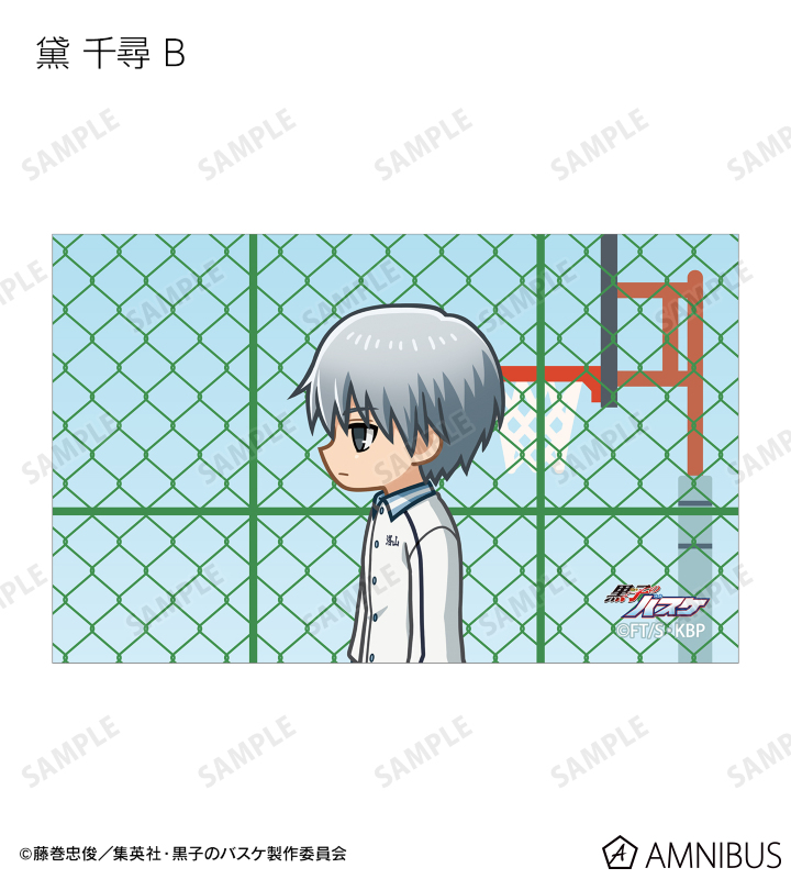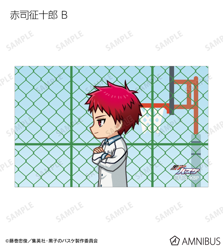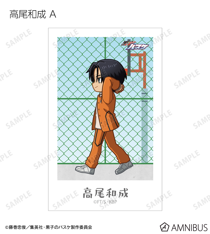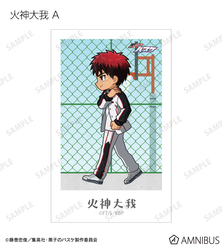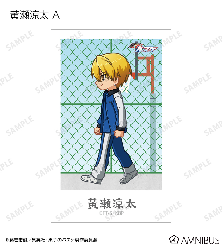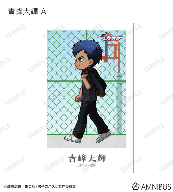 黒子テツヤ、火神大我、黄瀬涼太、笠松幸男、緑間真太郎、高尾和成、青峰大輝、今吉翔一、紫原 敦、氷室辰也、赤司征十郎、黛 千尋が歩いているちびキャラを新たに描き起こし、イラストカードに仕上げました。