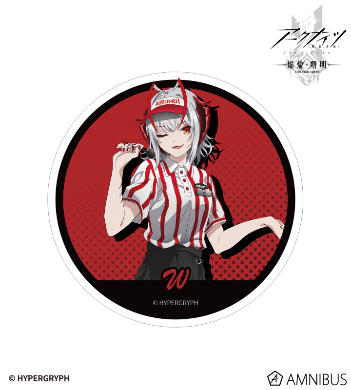 『アークナイツ【焔燼曙明/RISE FROM EMBER】』×「ROUND1」のコラボレーションアイテム「描き下ろし W アクティビティスタッフver. ダイカットステッカー」の登場です。